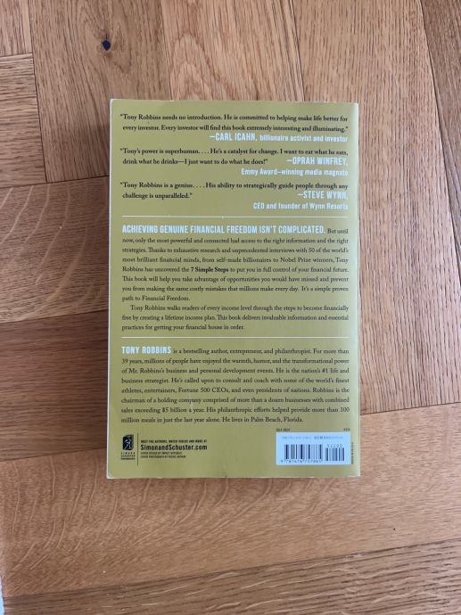 Tony Robbins je svojevrsni vodič - zna kako otvoriti vaš um i pripremiti ga za više ciljeve. Svojim jedinstvenim razumijevanjem ljudske prirode pronašao je način da pojednostavi strategije najvećih svjetskih investitora i osmisli sustav od 7 koraka koji svatko može koristiti na putu do financijske slobode koju zaslužuje.“ ‒ Paul Tudor Jones II, osnivač Tudor Investment Corporation i legenda burze s 28 uzastopnih godina pozitivnih rezultata za svoje investitore