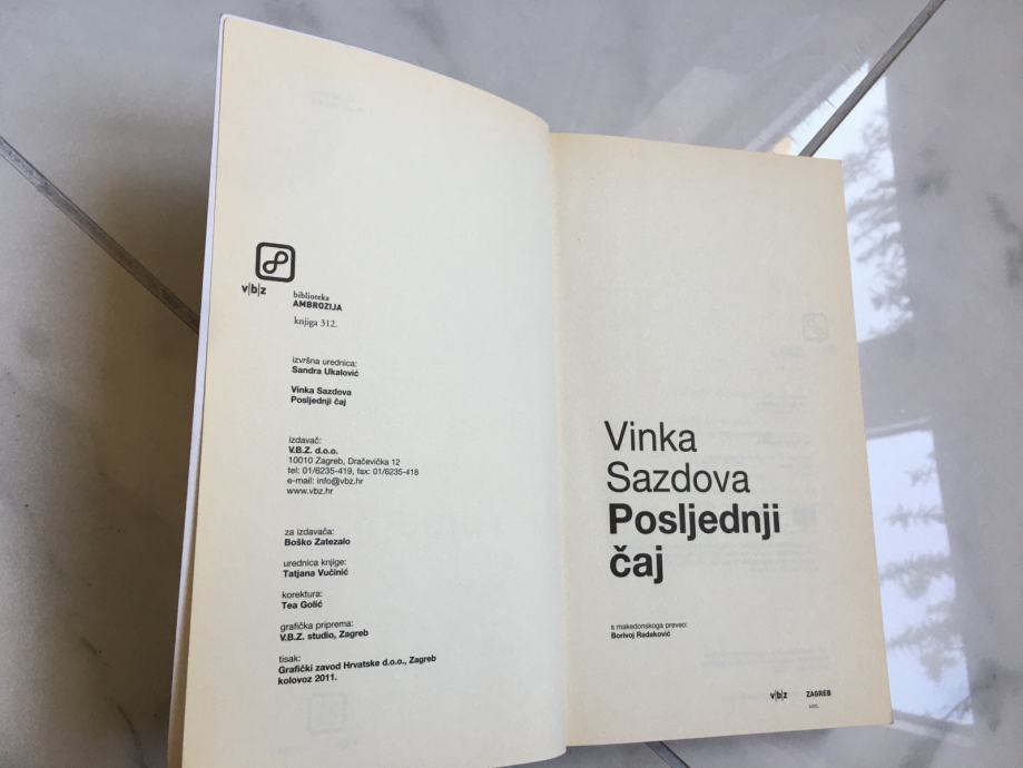 Vinka Sazdova rođena je 1956. godine. Školovala se na Filozofskom fakultetu u Skopju, na Odsjeku za psihologiju. Bila je novinarka kulturne rubrike u dnevnim novinama Večer i Republika. Radila je u nekoliko izdavačkih kuća, a osnivačica je i vlastite izdavačke kuće Tri, gdje trenutačno radi kao glavna urednica. "Posljednji čaj" njezin je prvi roman – bestseler koji je na području Makedonije doživio čak 6 izdanja. Nedavno je objavila i svoj drugi roman, "Polja divljih narcisa".