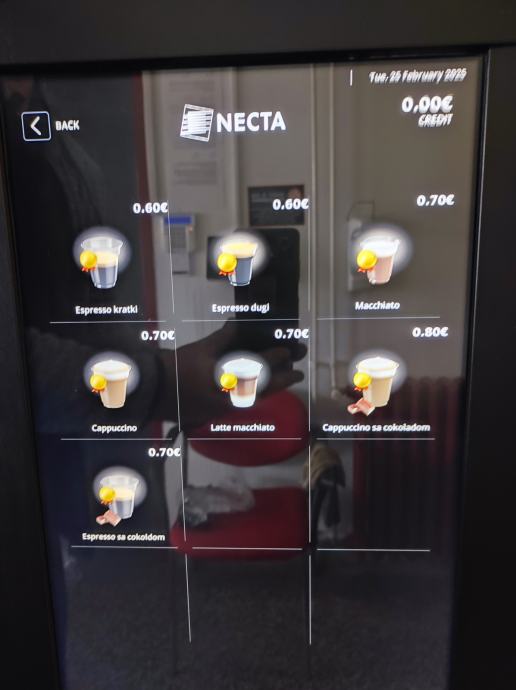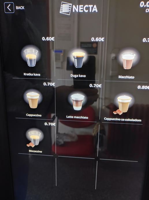 Prodaje se u izvrsnom stanju samoposlužni aparat Necta Canto touch.Koristi dvije kave u zrnu,dva mlinca,Nescafe, mlijeko, čokoladu...