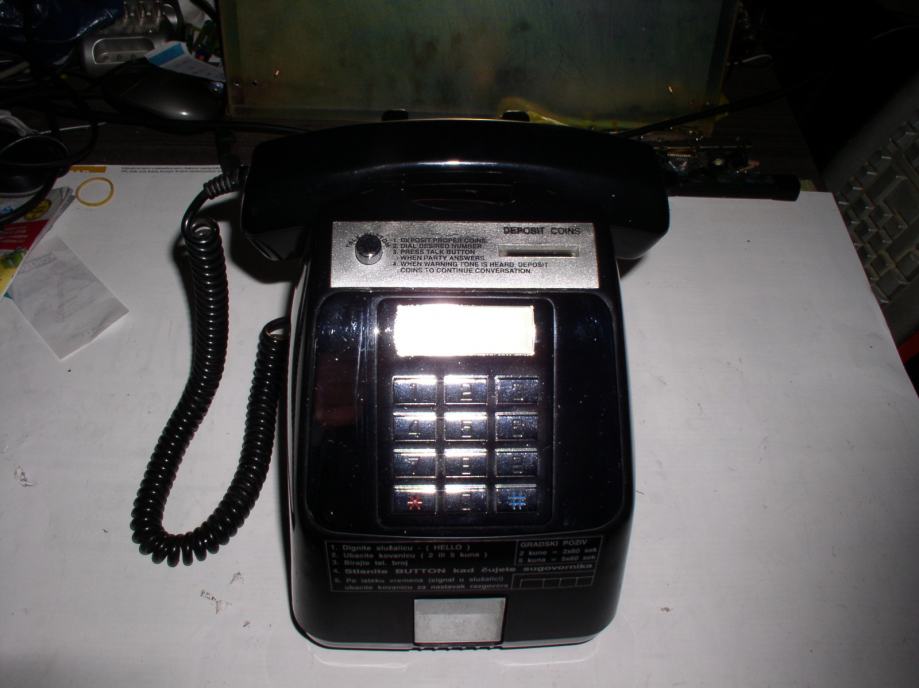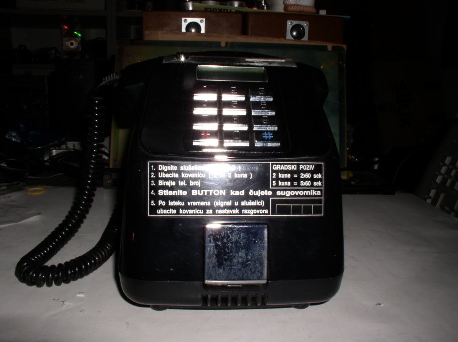 Telefon na kovanice 2,00 i 5,00 kn iz kafica,aparat je star 13-14 godina nije 30 godina kao sto neki pisu to je cista dezinformacija.Ja sam proizvodio te aparate i imam dosta novih dijelova ako nekome treba moze dobiti vrlo povoljno.