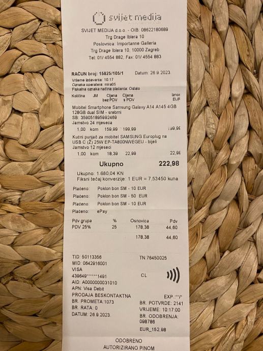 samsung galaxy A14, kupljen prije 15 mjeseci, bez oštećenja (život je proveo u maskici), jedina mana mu je što audio headphone jack ne reagira (ali ako koristite bluetooth slušalice, to vas ne zanima :D). euz njega dobivate originalni samsungov punjač, saljem besplatno preko boxnow usluge ili osobno preuzimanje na podrucju maksimira