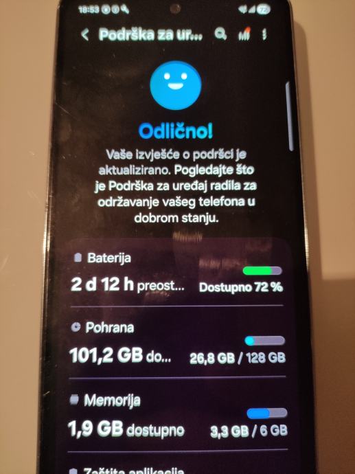Samsung Galaxy A 53 5 G, 6,5 inch,Super AMOLED zaslon, Gorilla Glas 5,64 MP+12+5+32 MP,HDR, RAM 6 GB, ROM 128 GB, NFC, 4 K, 5000 mAh, android 16,Bluetooth 5.1.Mobitel povremeno radi a povremeno ne/čini mi se da je u pitanju neki kontakt/.Zato je cijena niža.