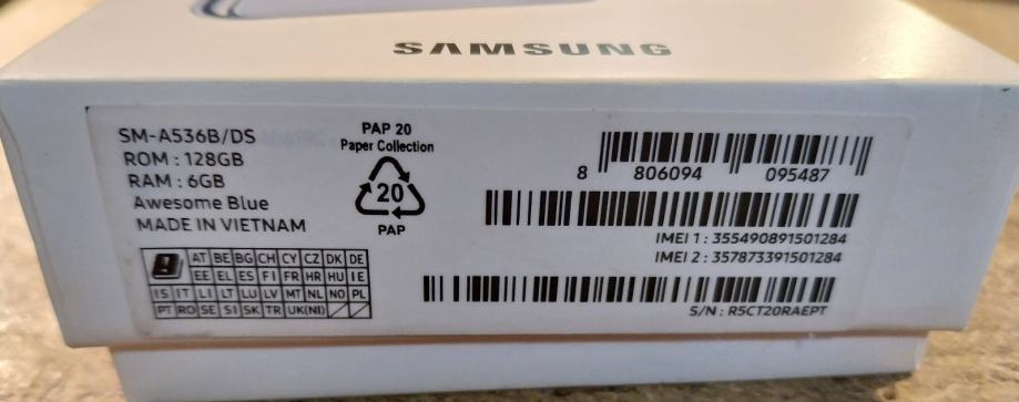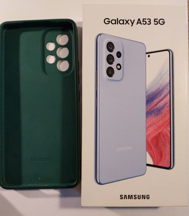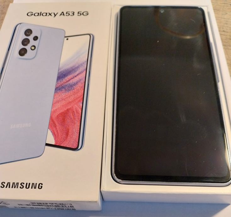 Mobitel Samsung Galaxy A53 5G, svijetlo plavi, kutija, maskica i kabel.