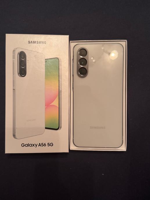 Prodajem rabljeni Samsung Galaxy A56 5G u svijetloj, srebrno-bijeloj boji. Dolazi s originalnom kutijom. Uređaj ima trostruku stražnju kameru i moderan dizajn s tankim okvirima oko ekrana.