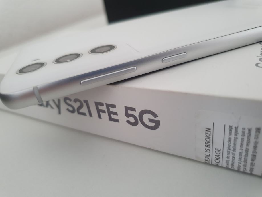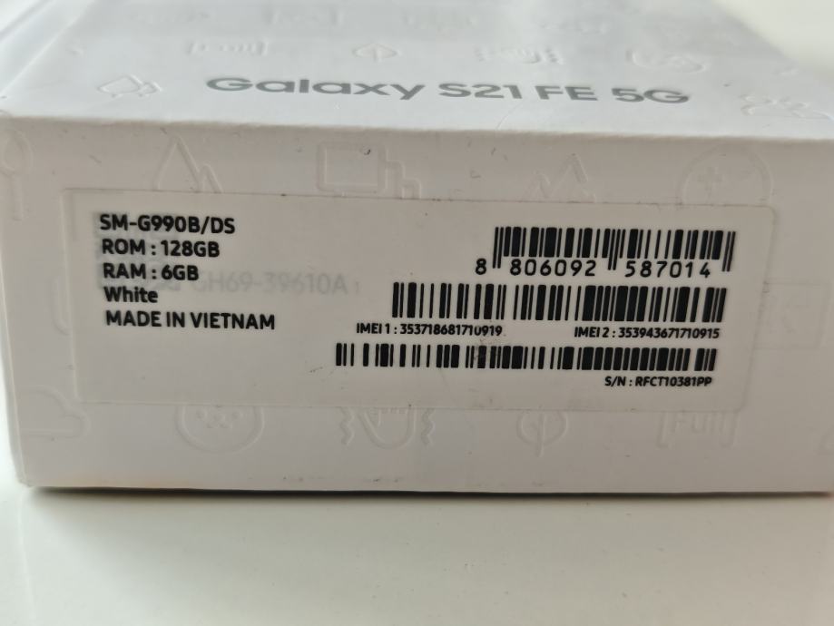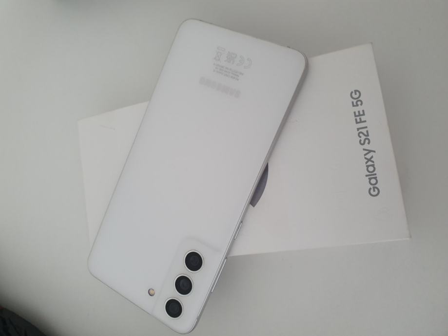 Prodajem rabljeni Samsung Galaxy S21 FE 5G u bijeloj boji. Radi se o modelu SM-G990B/DS (dual SIM) s 128GB interne memorije i 6GB RAM-a.