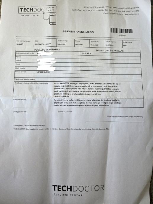 Odrađen servis (vidi sliku). Zamijenjena matična ploča, modul punjenja i vodljiva folija.