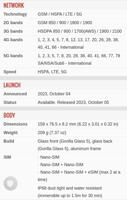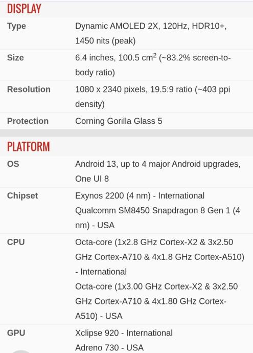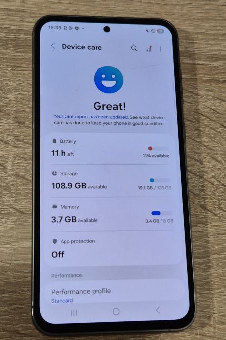 Mobitel je identičan S23 samo je FE edicija sa većim 6.4" ekranom. Baterija odlična, kao što se vidi na device care. Ima 8 GB RAM memorije i 128 GB storeagea.