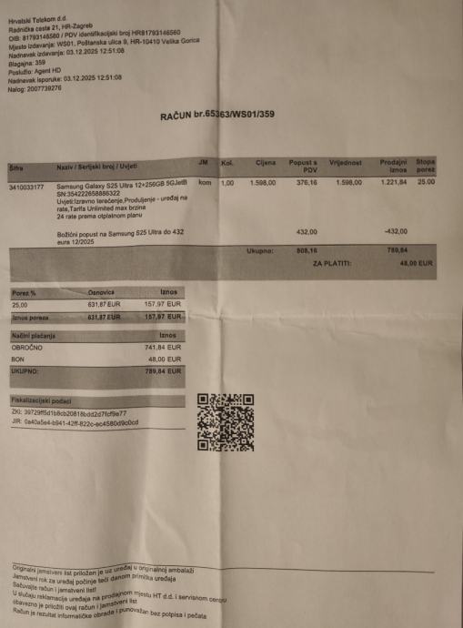 Prodajem navedeni Samsung Galaxy S25 Ultra 12 + 256GB Jet Black (crni) uređaj kupljen u T-mobilu za produženje ugovora 3.12.2025. Slike, račun i garancija u prilogu...