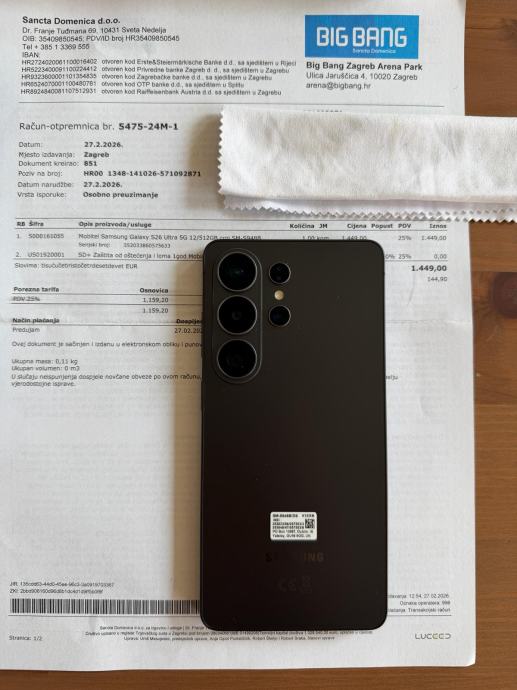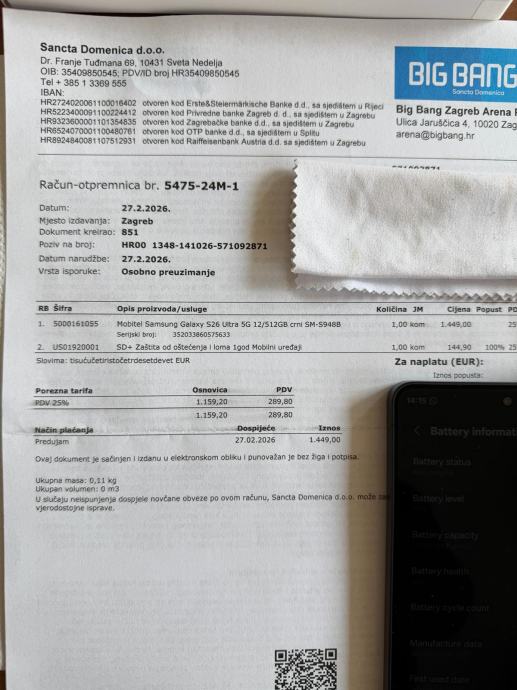 Prodajem mobitel iz naslova kupljen u Bing Bang (Santa domenenica) 27.02.2026.