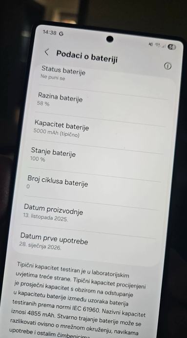Izvađen iz kutije, upaljen 28.01.2026. (vidi sliku, nije punjen), stavljeno staklo na ekran, kupljena maskica…prevelik za moju ruku, ostavljen u kutiji, nekorišten dalje!