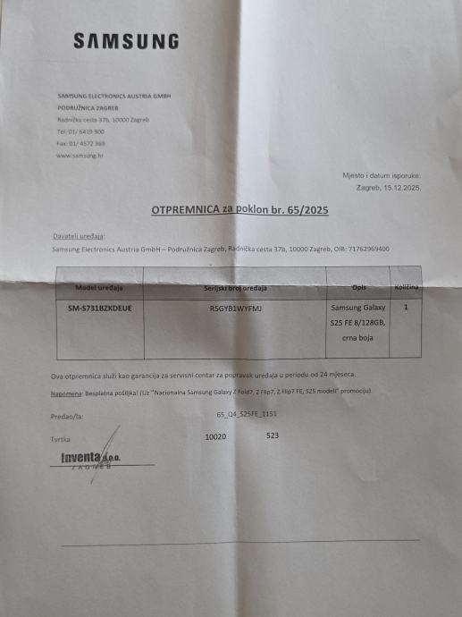 Prodajem novi neotpakiran crni S 25 FE 8/128, kupljen 15. prosinca 2025 za 400 Eura.