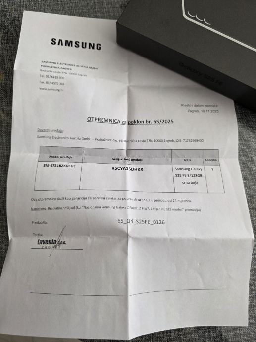 Prodajem potpuno novi, nekorišteni Samsung Galaxy S25FE s originalnim pakiranjem i računom. Dobijen na poklon uz drugi Samsung uređaj. Telefon je u savršenom stanju s punim dvogodišnjim jamstvom. Isporučuje se s kompletnom dokumentacijom, kutijom i svim pripadajućim dodacima. Moguća dostava u Puli i okolici. Moguća je i mala korekcija cijene.