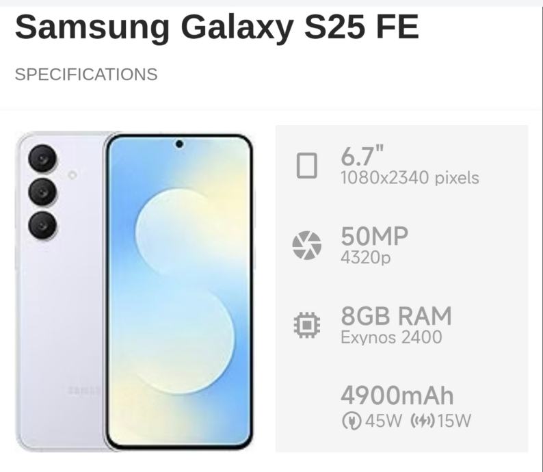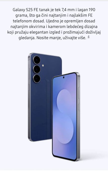 Prodajem nov Samsung Galaxy S25 FE mobitel u Jetblack boji. Uređaj ima 8GB RAM-a i 128GB interne memorije. Radi se o neotvorenom mobitelu s 6,7" zaslonom (1080x2340 piksela), 50MP kamerom, Exynos 2400 procesorom i baterijom od 4900mAh s podrškom za brzo punjenje (45W). Garancija 24 mjeseca.
