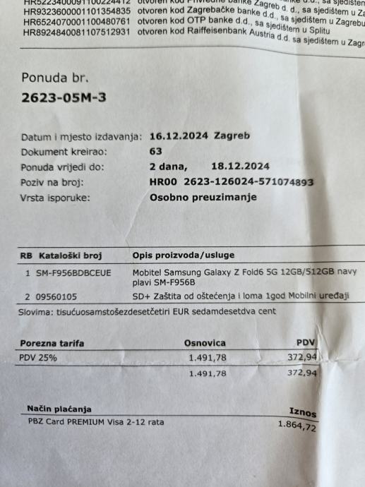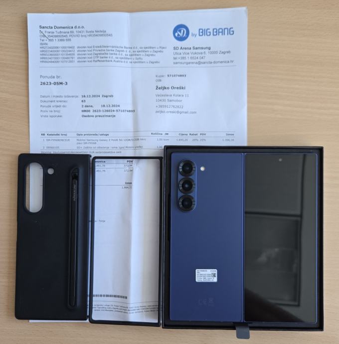 Prodajem Samsung Z Fold 6 blue sa 12gb rama i 512gb skladišne memorije. Uređaj je u stanju novoga. Račun i garancija Big Bang (Sancta Domenica). Uz uređaj plačena zaštita cijelog uređaja u trajanju od godinu dana (130€). Također kupcu dajem maskicu sa olovkom. Cijena 1100€. Cijena u zamjeni veća. Primopredaja zg, ostalo po dogovoru. Kontakt može poziv, sms, viber, whatsapp.
