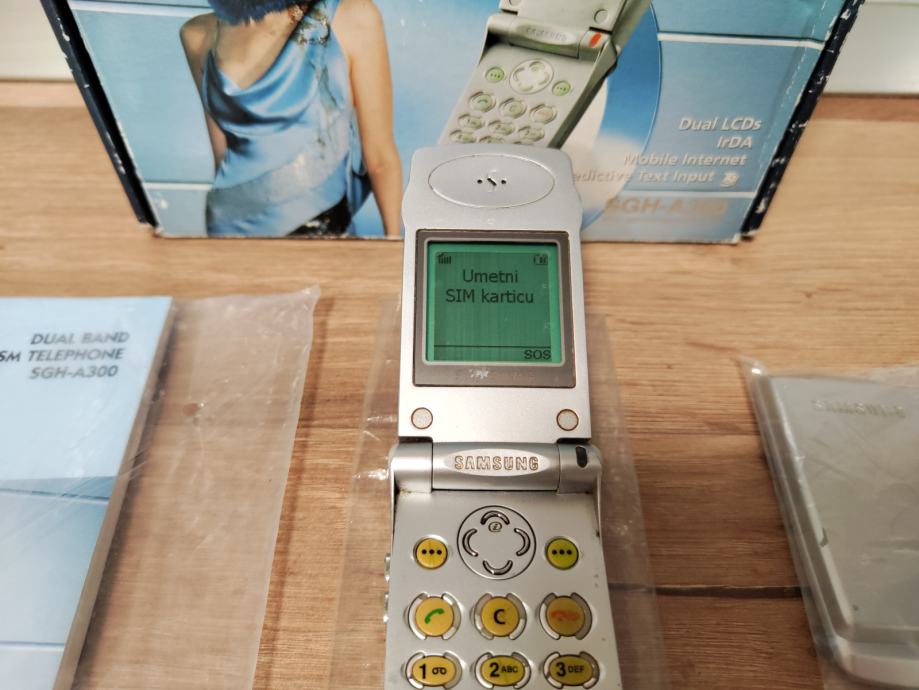 SAMSUNG SGH-A300 preklopni mobitel u top stanju jako teško danas nači ovako uredan i ispravan sa original kutijom uputama, novim slusalicama i ima dvi baterije obe ispravne , ima HR meni, ovakav danas nećete lako naći