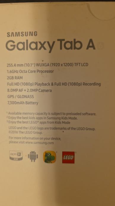 Prodajem tablet Samsung Galaxy Tab A6, ekran 10,1”, 2 GB RAM, 32 GB memorije, originalno pakiranje, kao novi, jako malo korišten (zadnje dvije godine stajao u ladici), kupljen u trgovini Vacom, plaćen 1300 kn, potpuno ispravan. Cijena 50 € fiksno, Virovitica, 098/287-323.