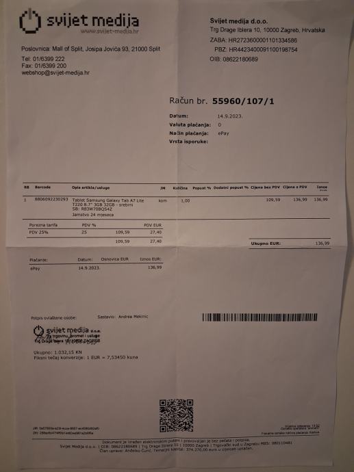 Prodajem tablet Samsung Galaxy Tab A7 Lite 3GB/32GB, srebrni, Android 14, kupljen 09.2023., malo korišten, s maskom i originalnom ambalažom. Cijena: 75,00 €. Mob: 091-768-5229