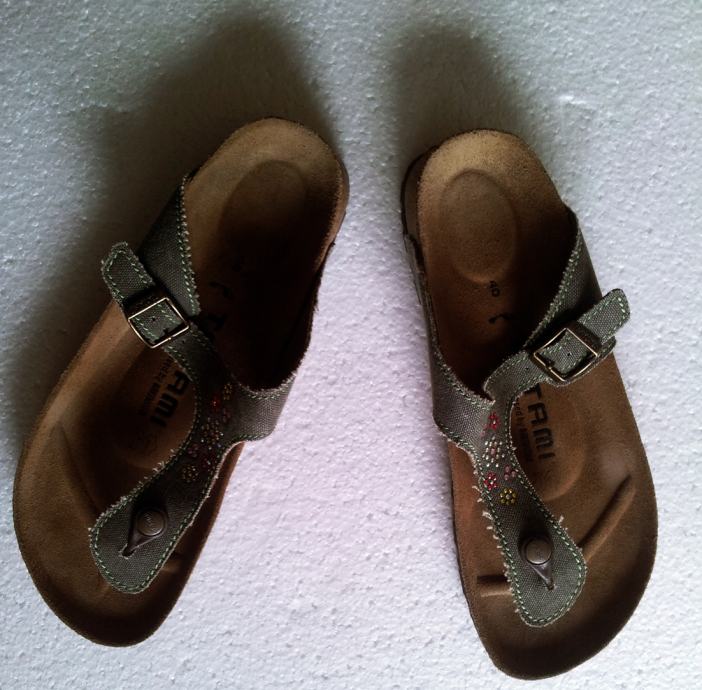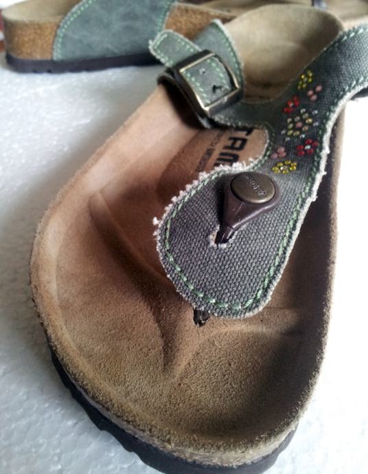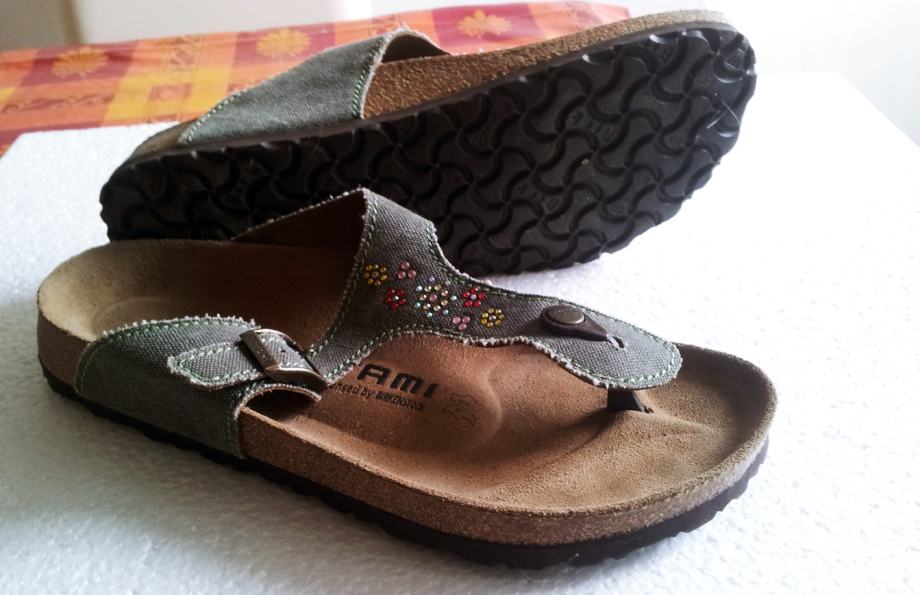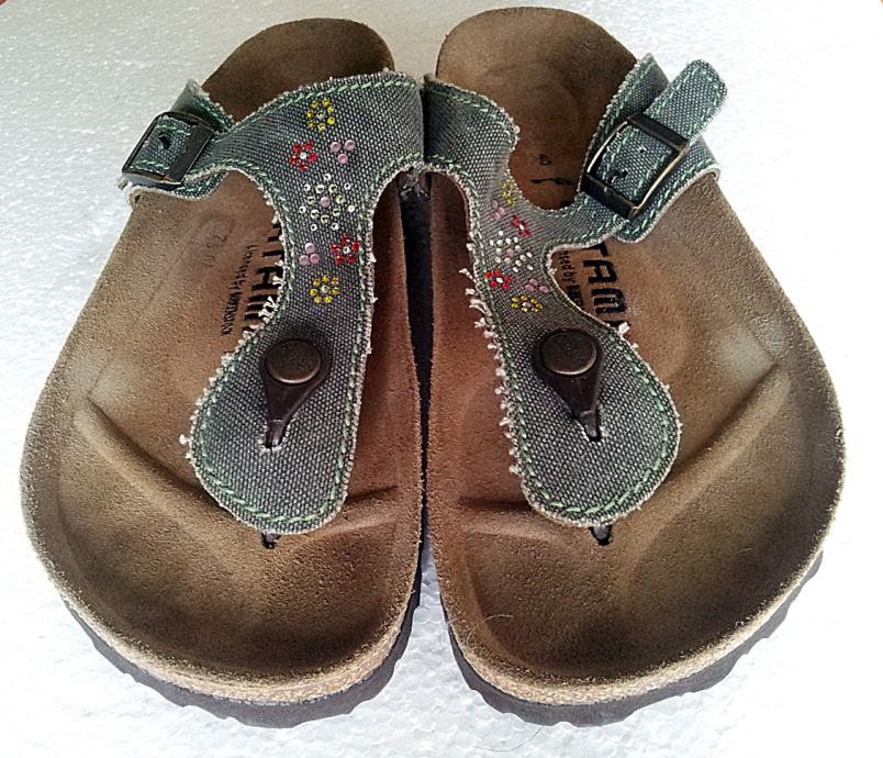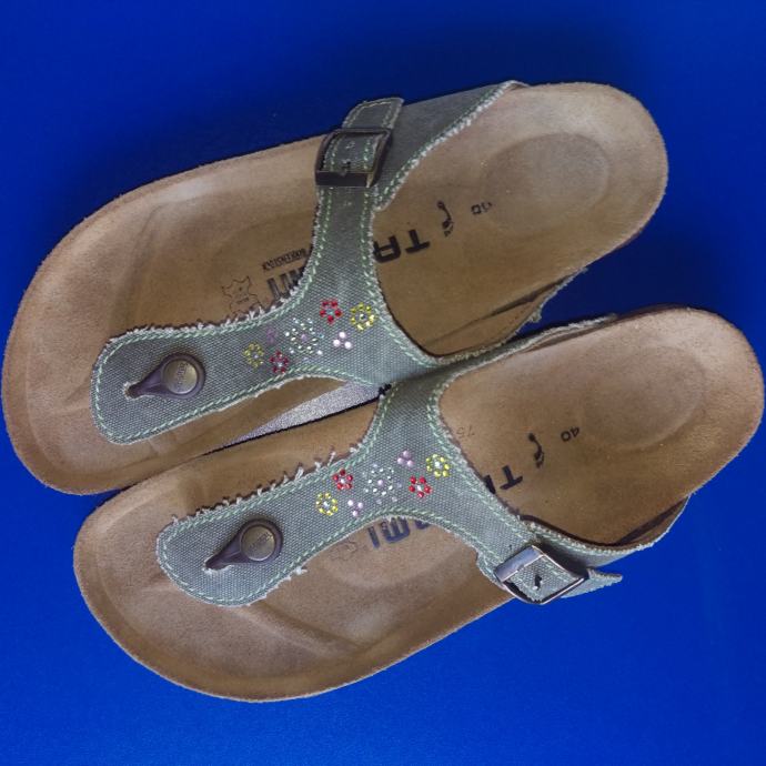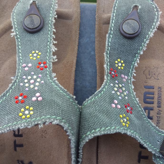 Tatami Birkenstock japanke / sandale, gornji dio traper maslinasto-zelene boje ukrašen cvijetovima od Swarovski kristala.