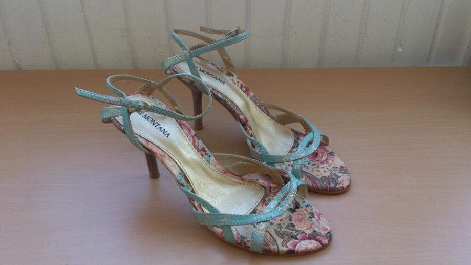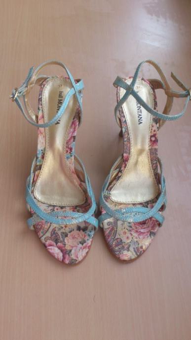 BULL MONTANA KOŽNE SANDALE-kao nove,jednom obuvene-broj 37-prava koža,slagana peta-po svim remenčićima nacrtane i posute zlatne šljokice/crtice-Cijena:75kn