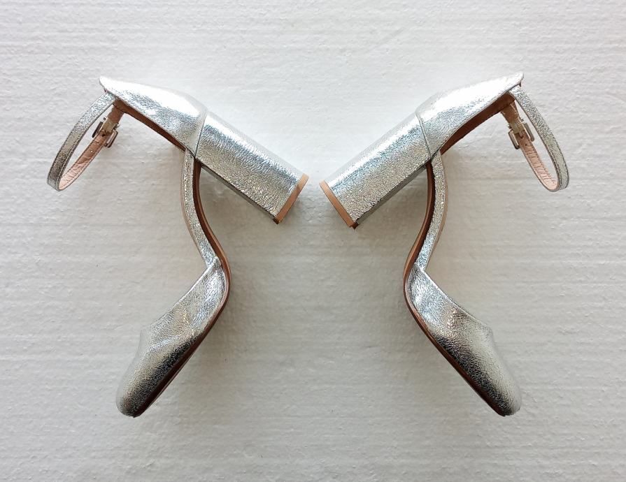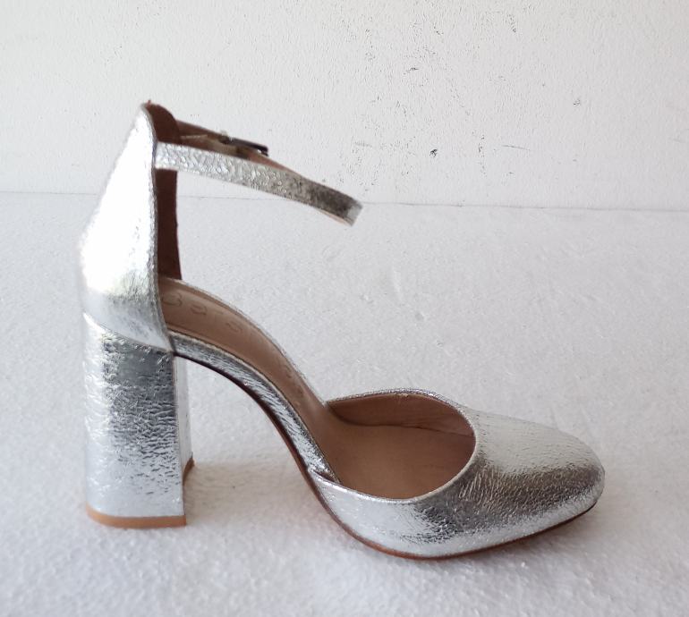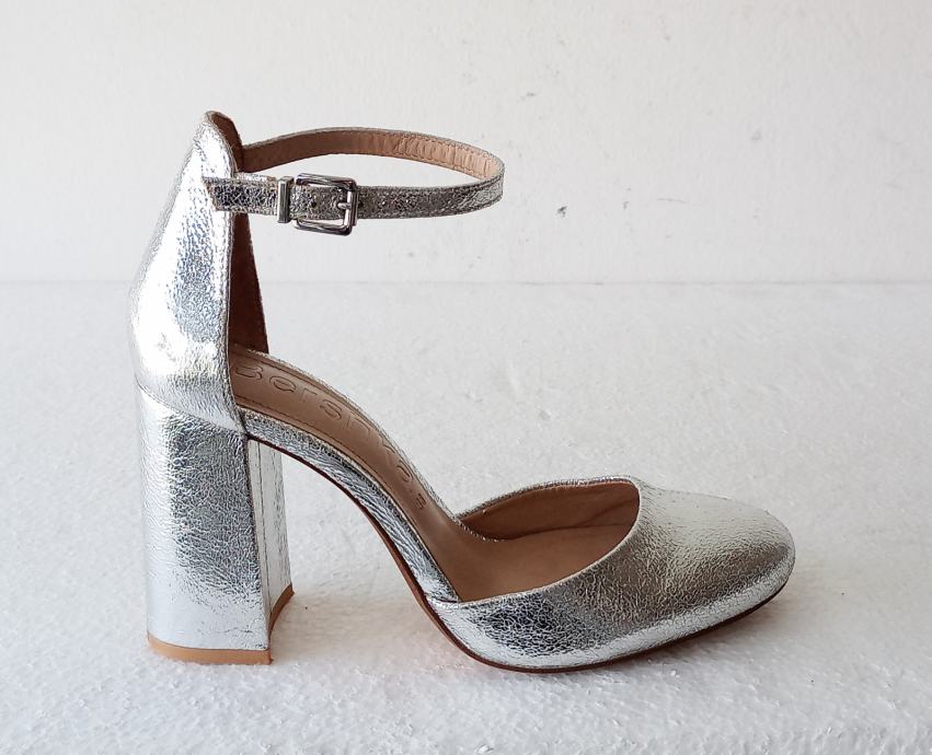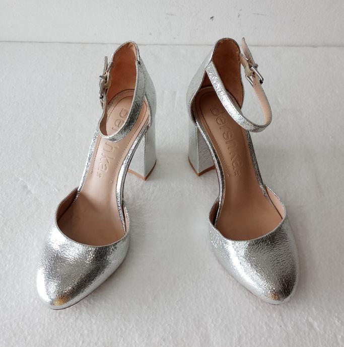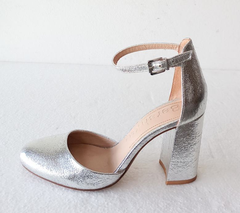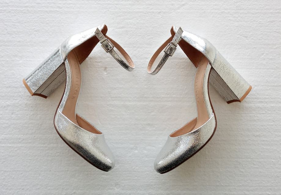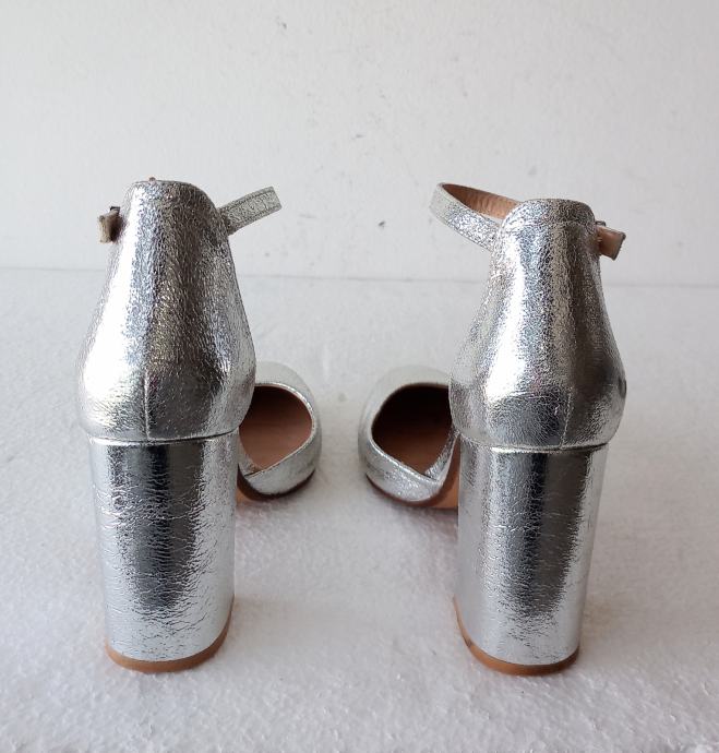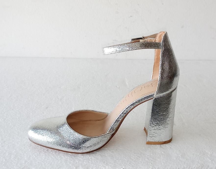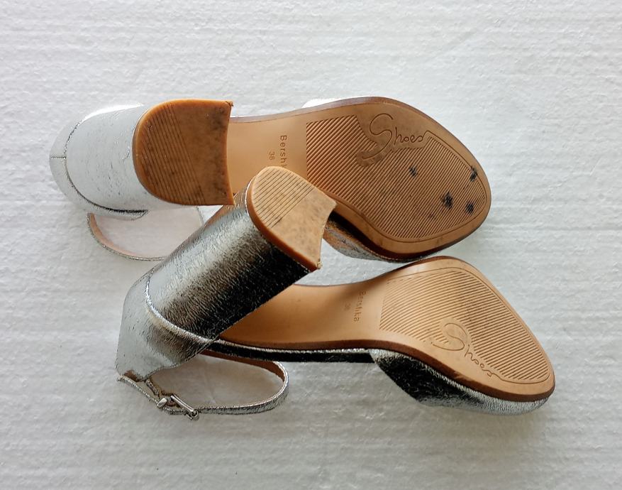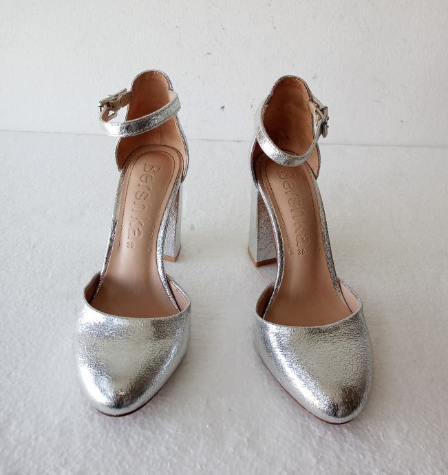 BERSHKA srebrne sandale sa remenčićem. Veličina 38 (unutarnje gazište 25,5 cm). Blok peta visine 9 cm. Korištene za jednu prigodu.
