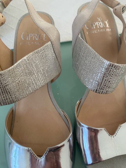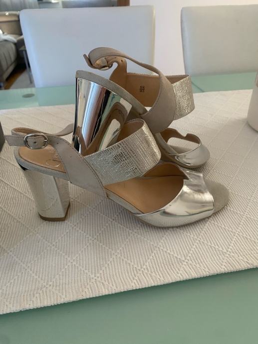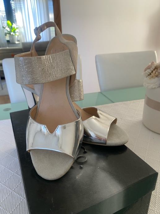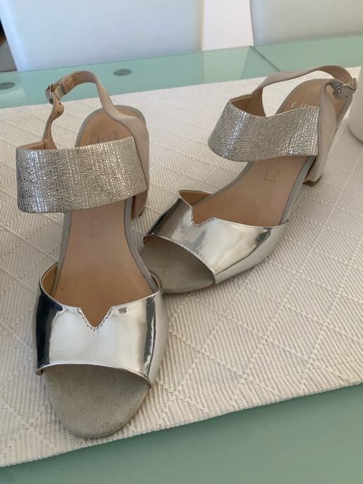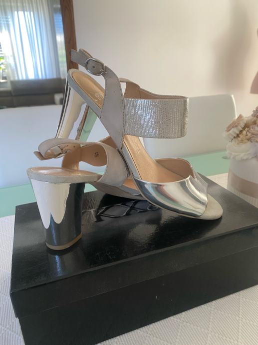 Obučene jednom na svadbu. Veličina 38,5, srebrna boja, kompletno od kože. Jednostavne, elegantne i mogu se nositi po ljeti na sve kombinacije. Jako ugodne i stabilne. Visina pete nešto manje od 9 cm.