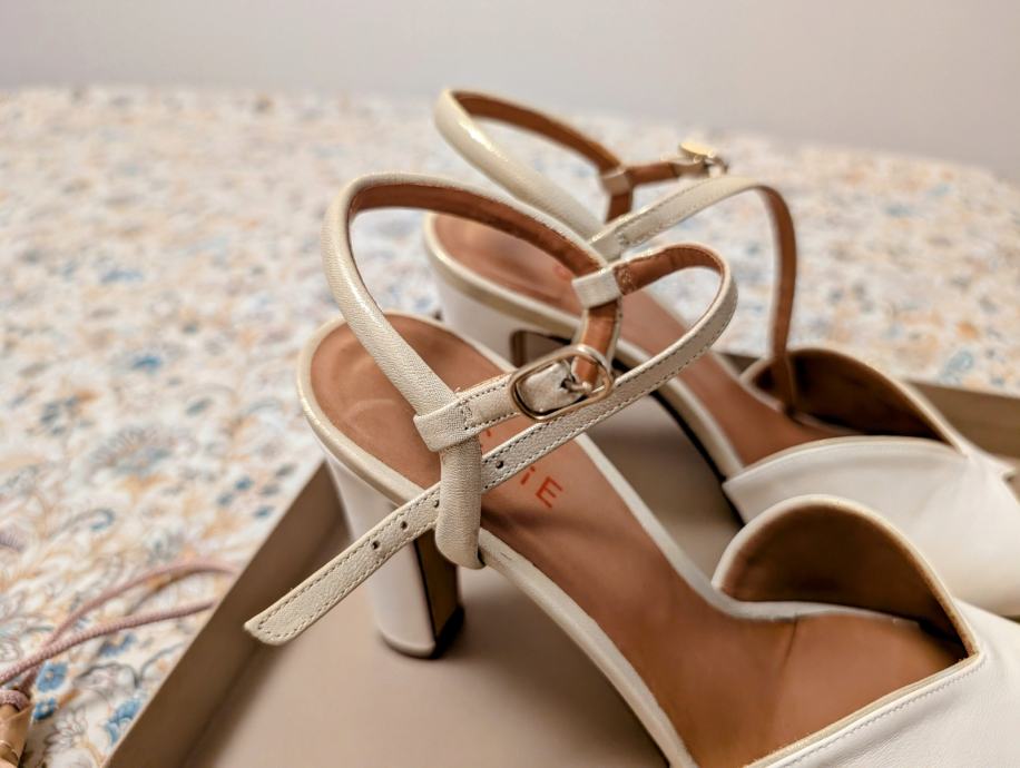 - bijela boja, trakice i detalji u metalik boji šampanjca, kopčica metalna zlatne boje