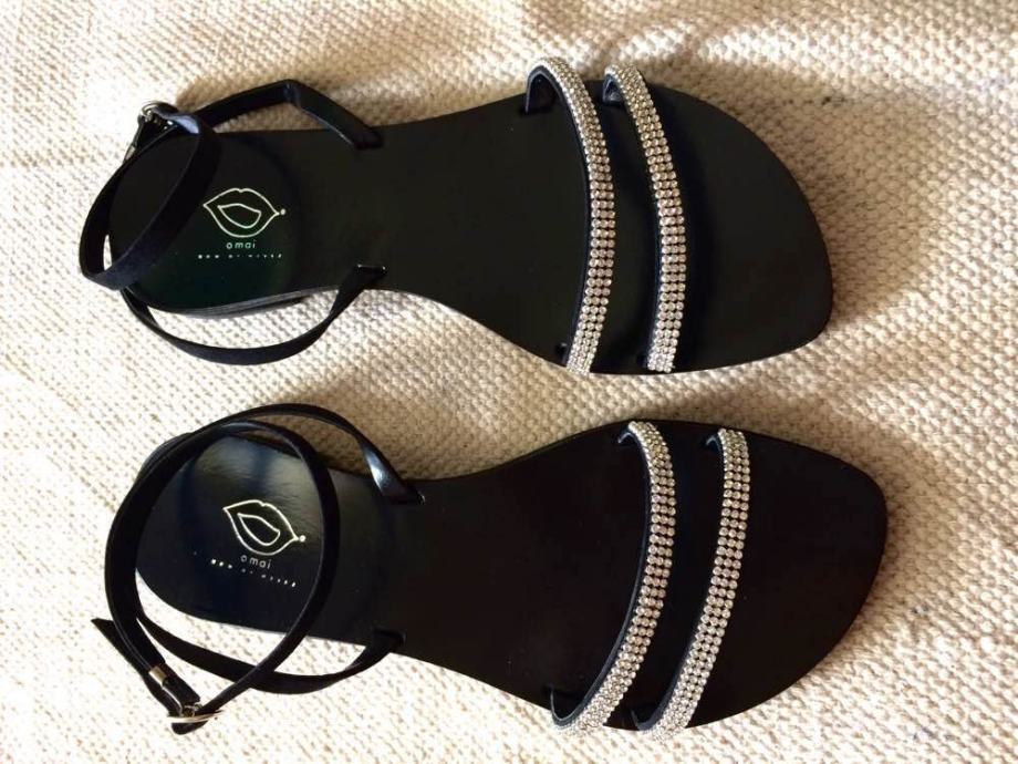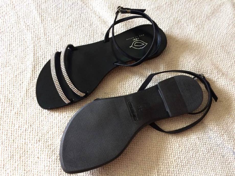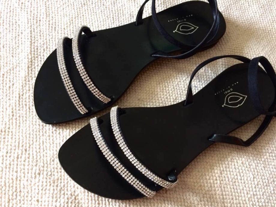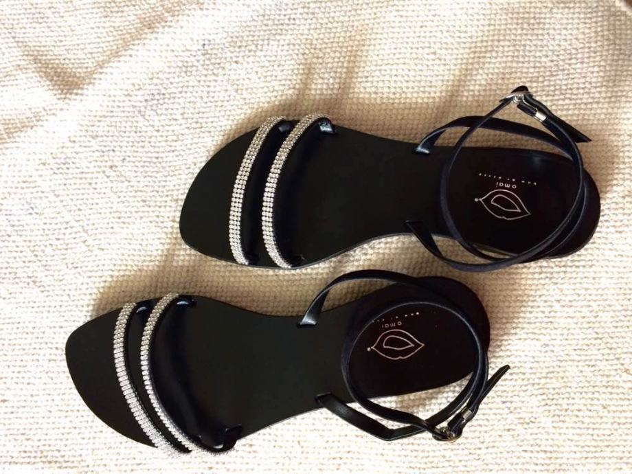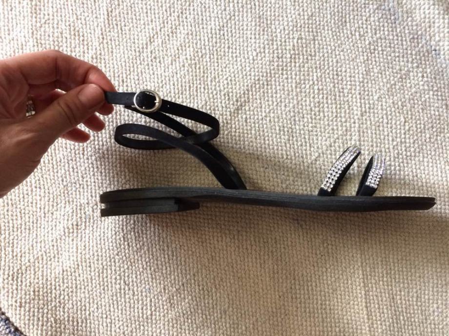 Nove nikad nošene niske crne sandale sa 2 remena naprijed ispunjena cirkonima.