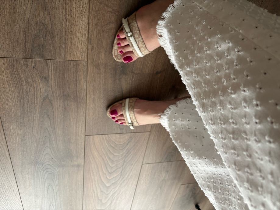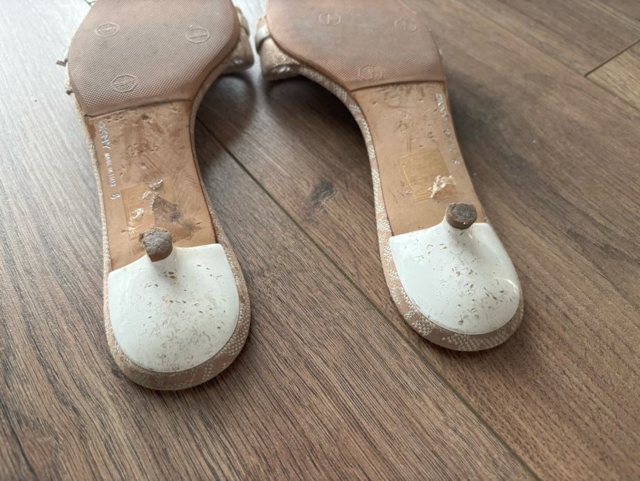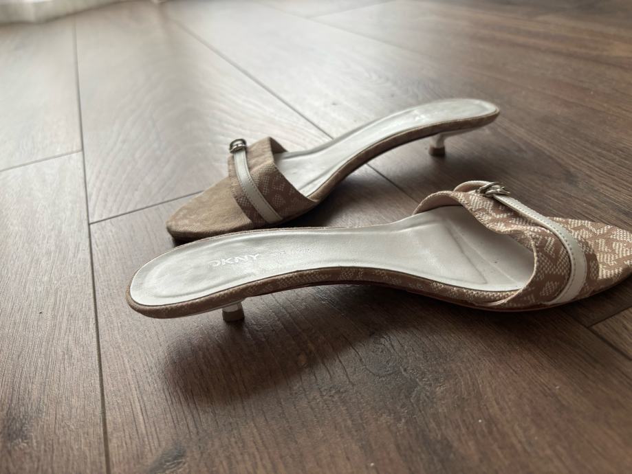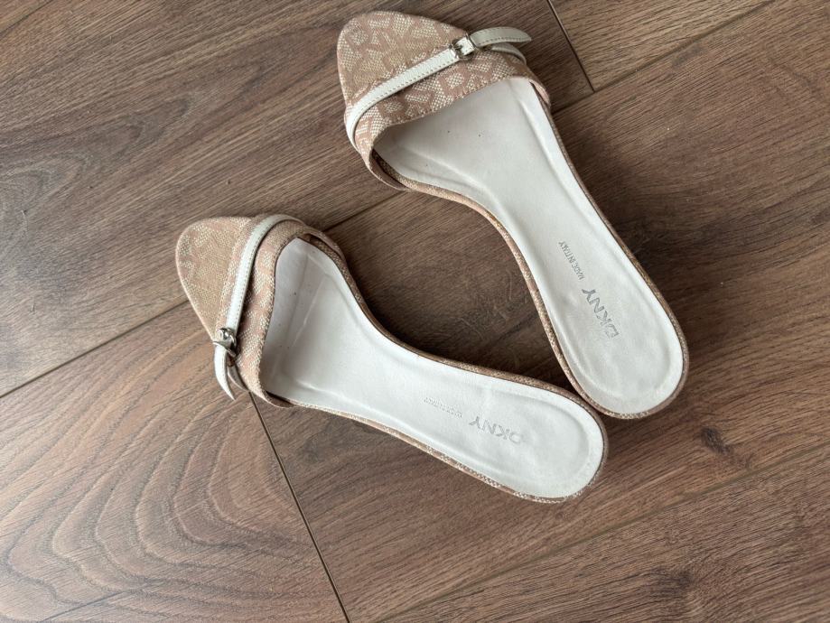 Dkny (donna karan new york) sandale/natikace. Americka velicina 6. Duzina od ruba do ruba 23 cm. Rekla bih cisti 36. Nosene nekoliko puta. Na peti ogrebane kako se vidi na slici a to se ne vidi dok se nose a vjv se da jeftino srediti kod postolara.