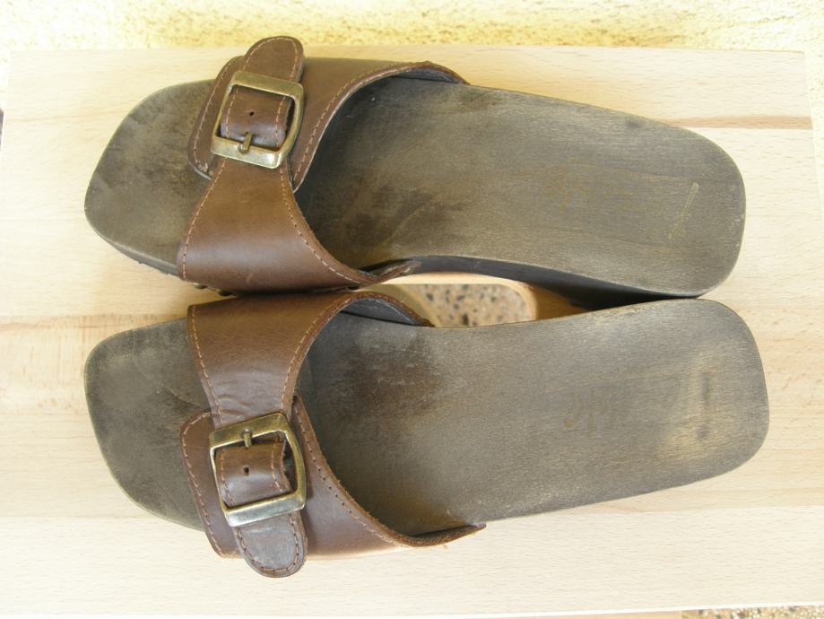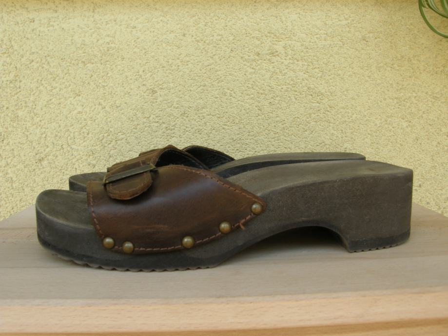Drvene klompe-natikače br. 38, koža odozgo, kožni potplat, visina pete 4,5 cm. Nošene svega par puta, u odličnom stanju, kao nove.