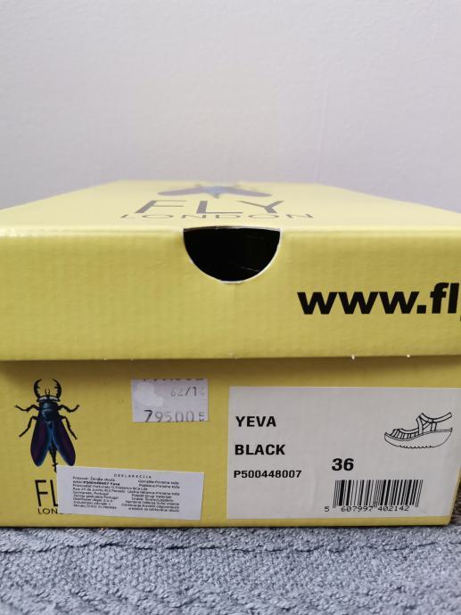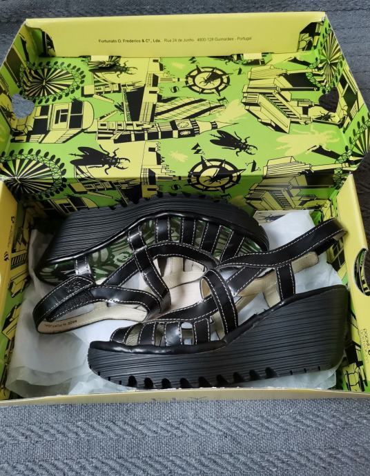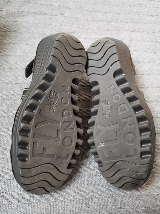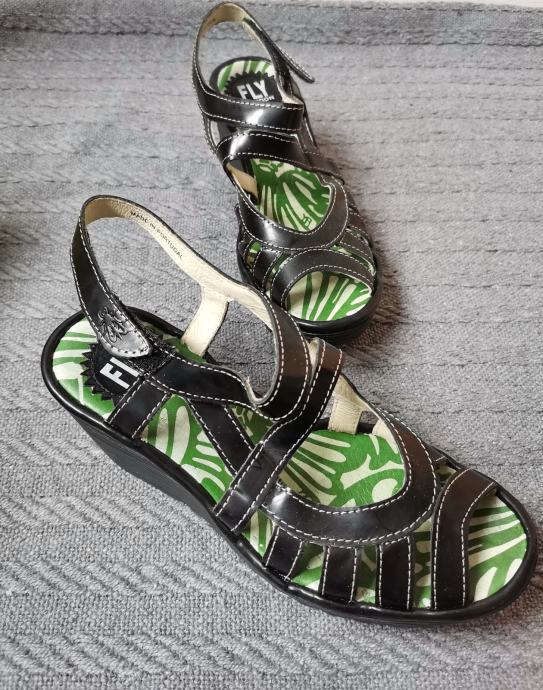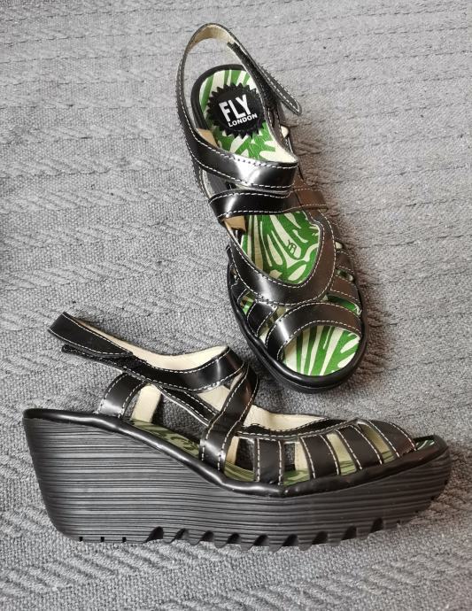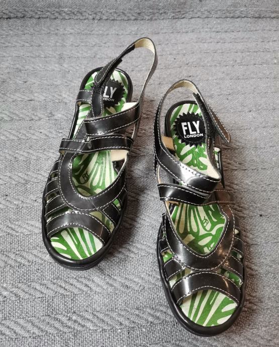 Fly London crne sandale na punu petu, možda jednom prošetane.