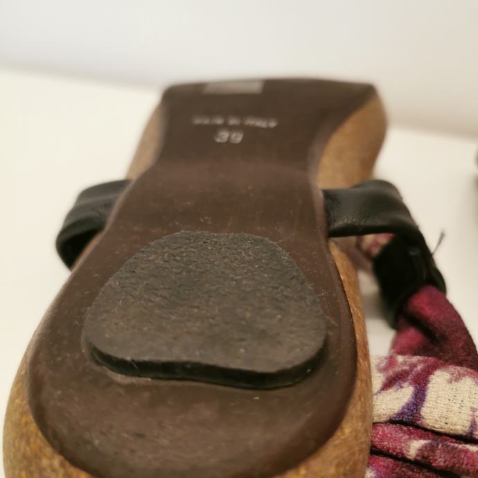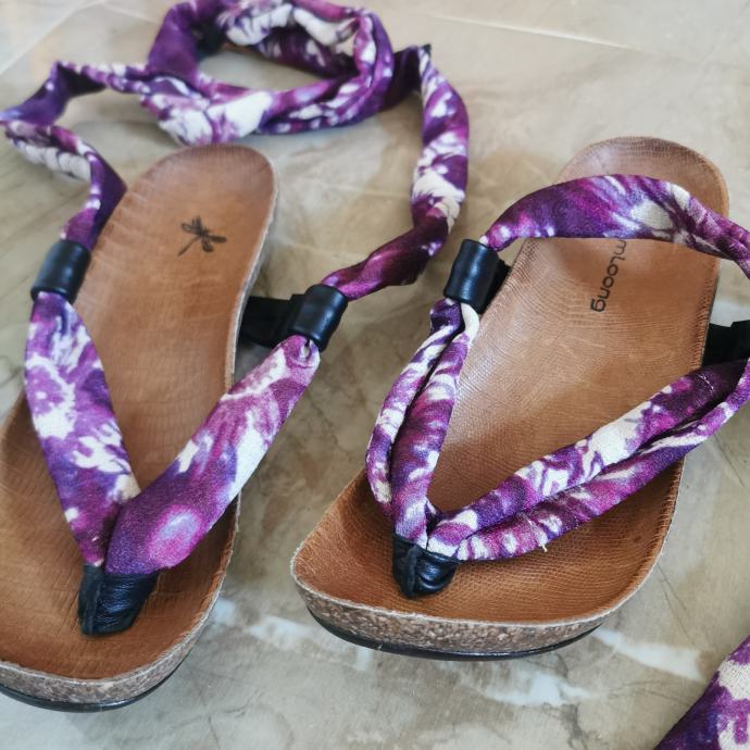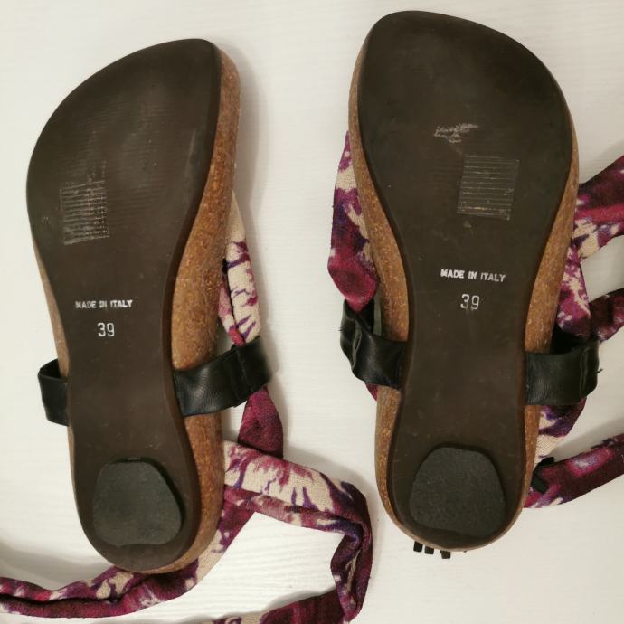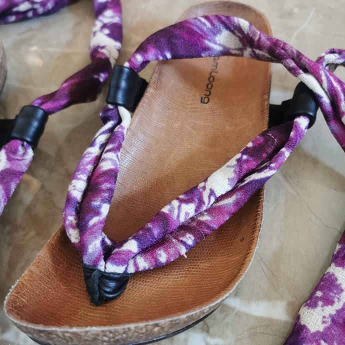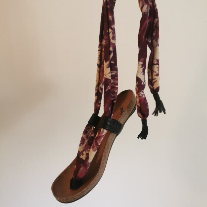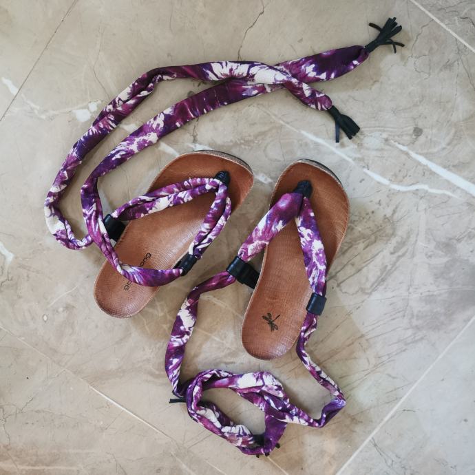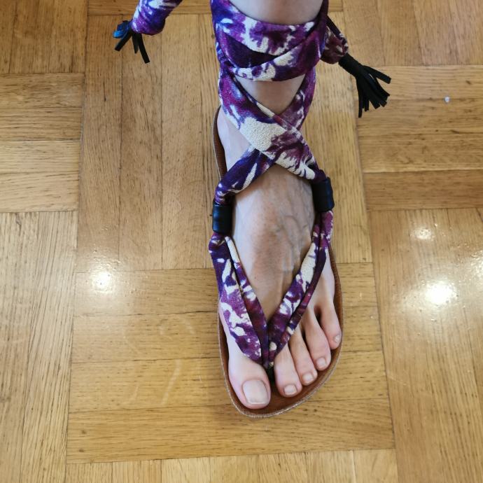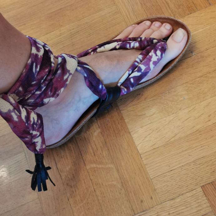 Prekrasne lađa sandale japanke, koje se vežu oko gležnja s tkaninom kao marama, koja je spojena s cipelom s kožom te na vrhovima završava s kožnim resama, a koža je i između prstiju.