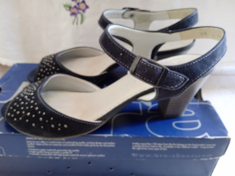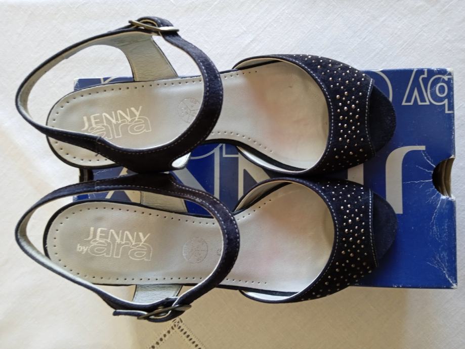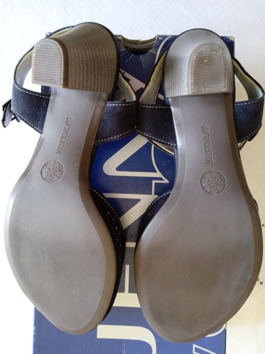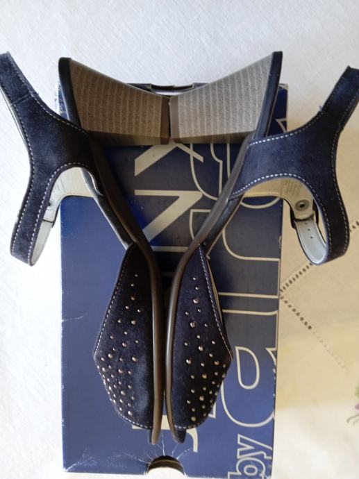 Sandale od brušene kože tamno plave boje sa petom visine 5 cm i sjajnom dekoracijom na prednjem dijelu. Zatvaranje na jednu kopču čija širina se može regulirati. Marke "Ara", u originalnoj ambalaži, korištene svega nekoliko puta. Veličine 38,5/5.5. Vrlo ugodne za nošenje.