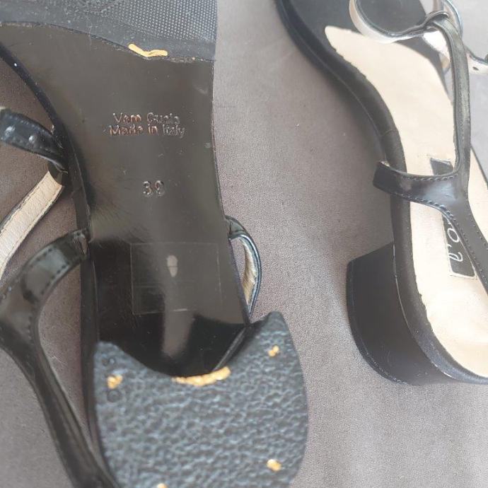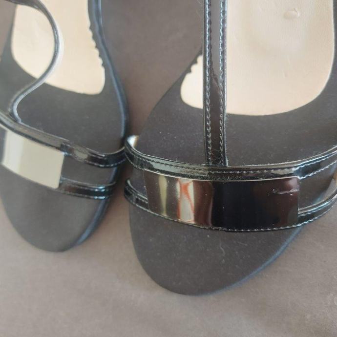 Nenošene, kožne, s metalnim detaljem, visina pete 3 cm.