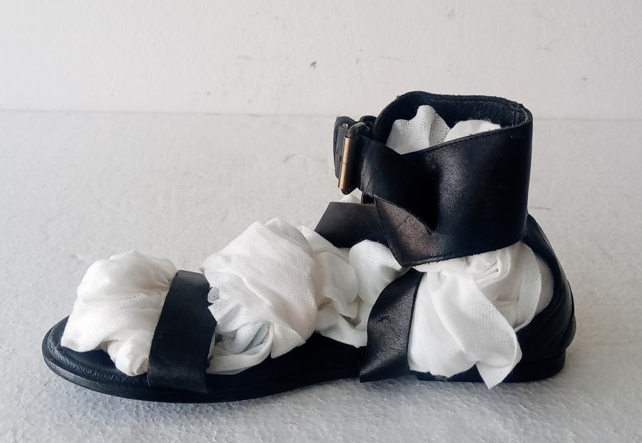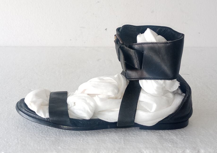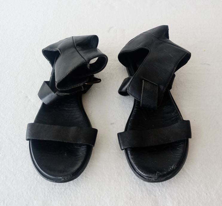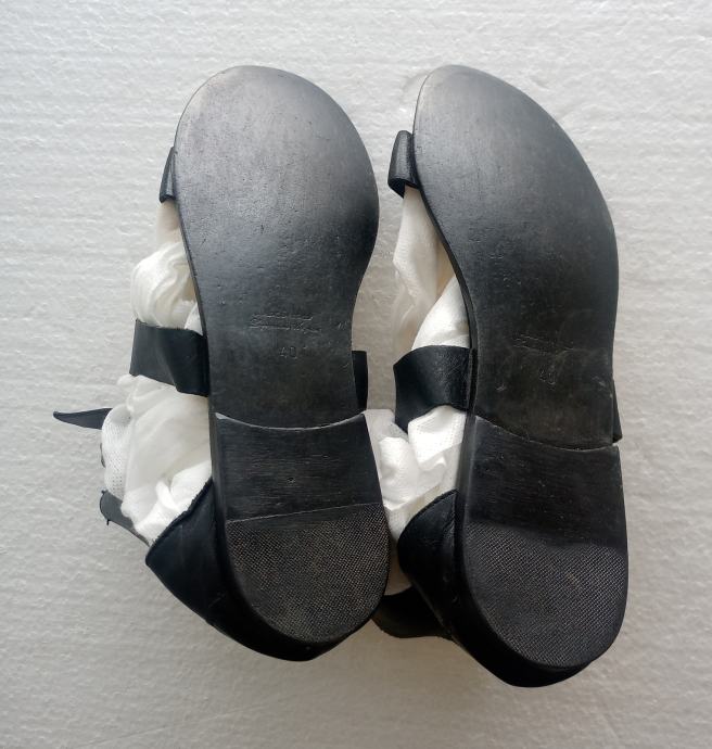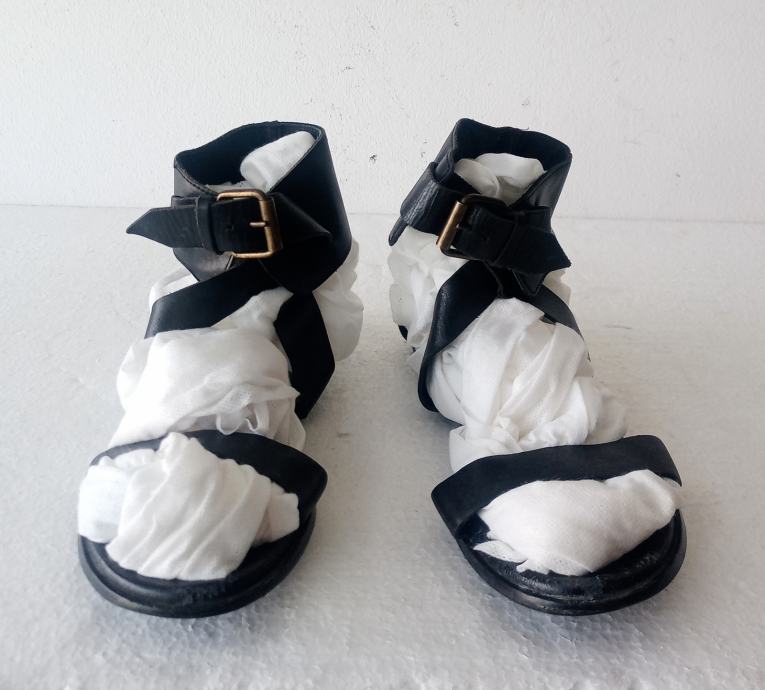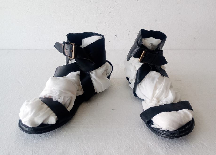 Lavorazione Artigiana (oznaka za ručno rađene, lokalno u Firenzi, mali obrtnik- nebrendirane) ravne sandale sa remenima. Unutrašnje gazište 26,5 cm. Izrađene od čvrste prirodne kože crne boje. Visina široke pete je 1 cm. Nošene, ali očuvane.