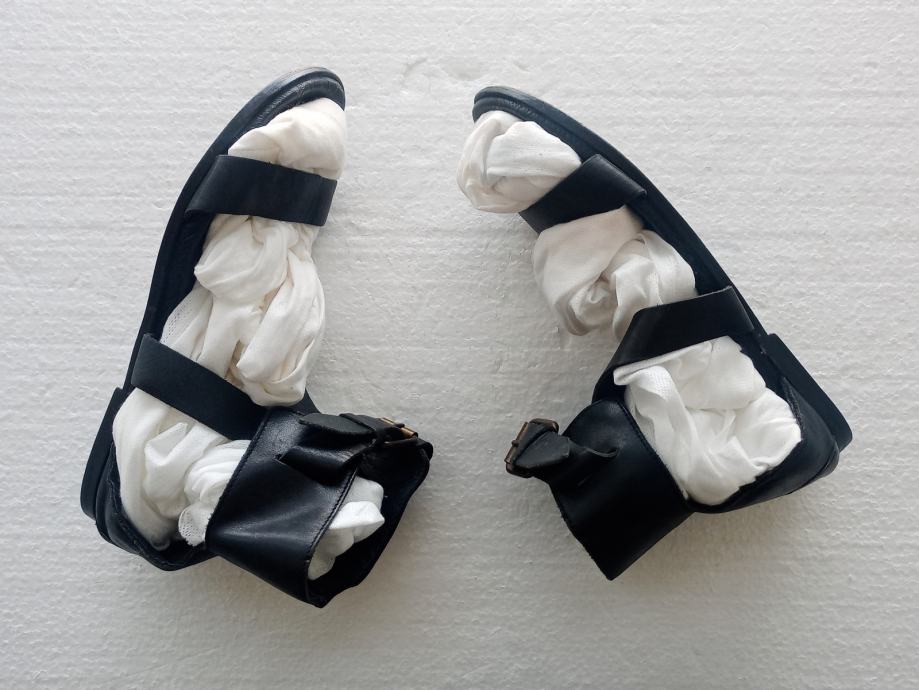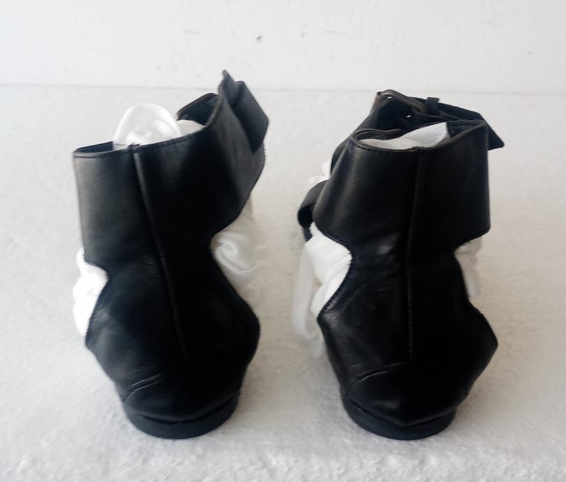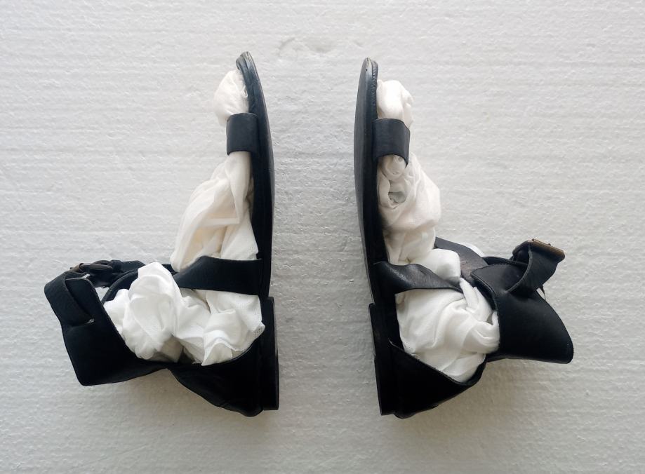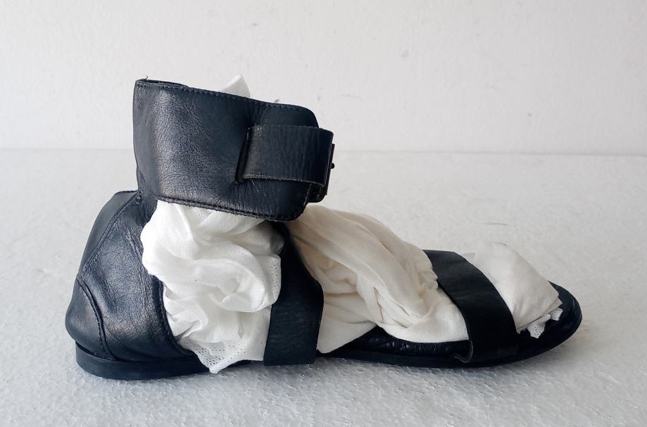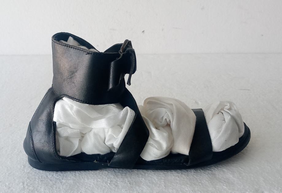 Lavorazione Artigiana (oznaka za ručno rađene, lokalno u Firenzi, mali obrtnik- nebrendirane) ravne sandale sa remenima. Unutrašnje gazište 26,5 cm. Izrađene od čvrste prirodne kože crne boje. Visina široke pete je 1 cm. Nošene, ali očuvane.