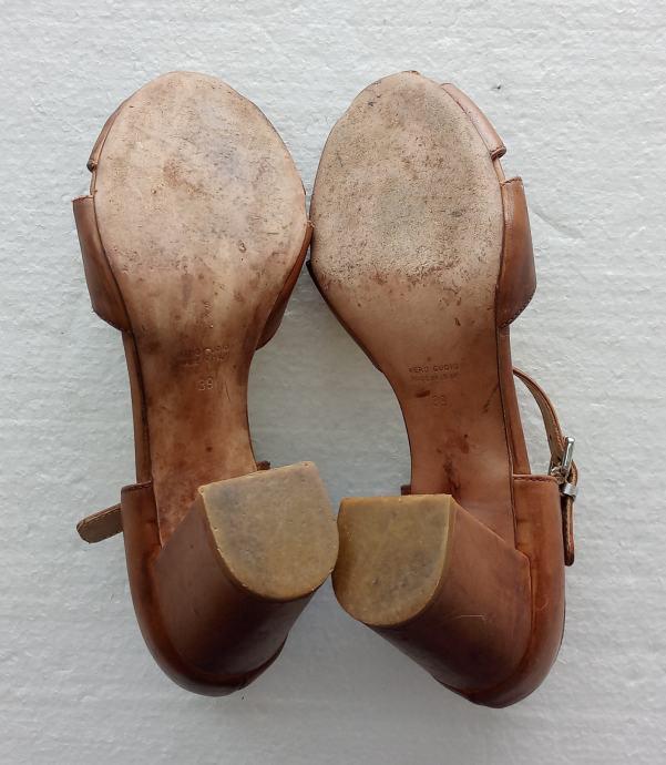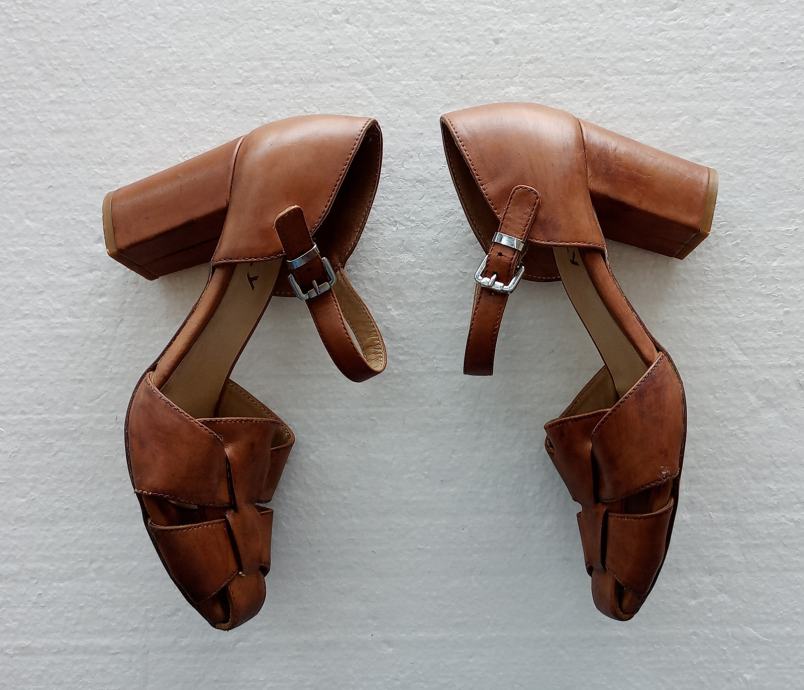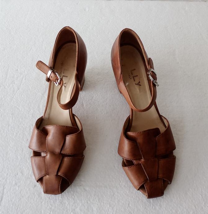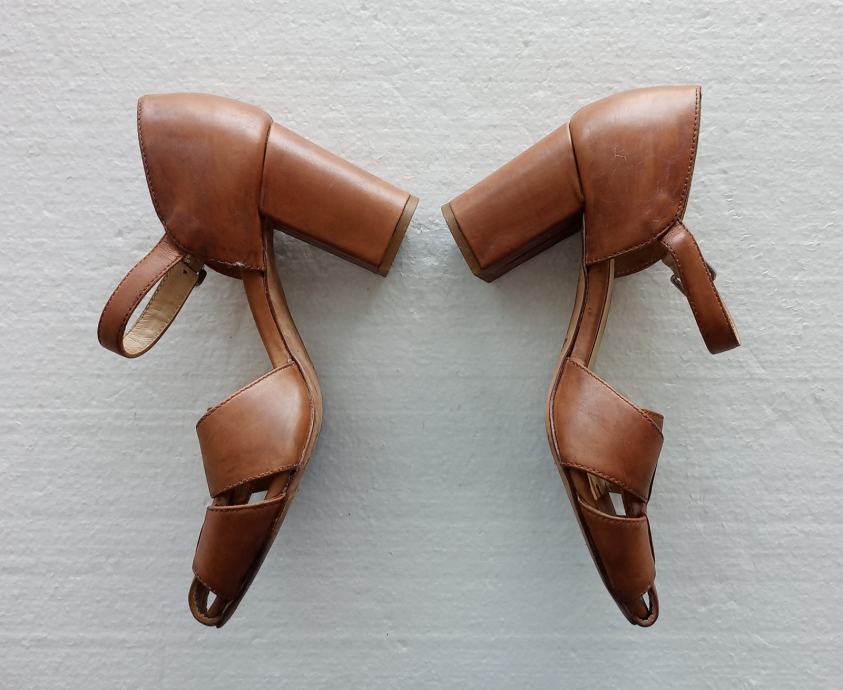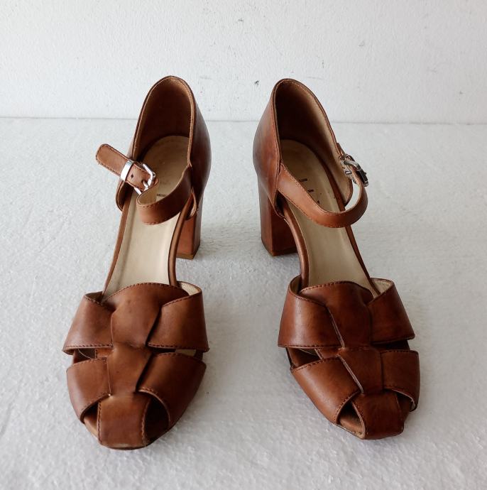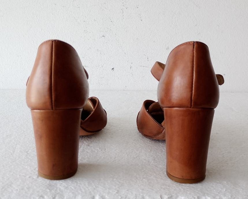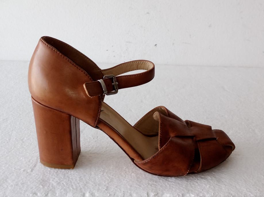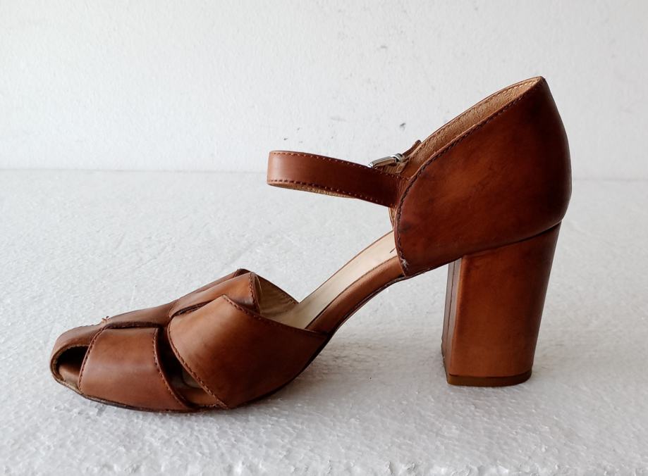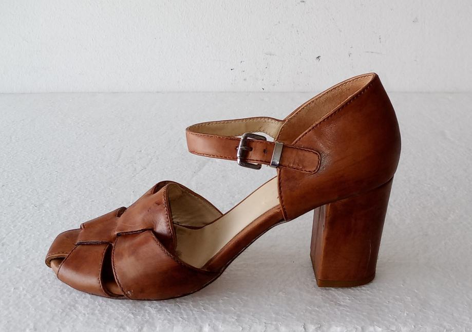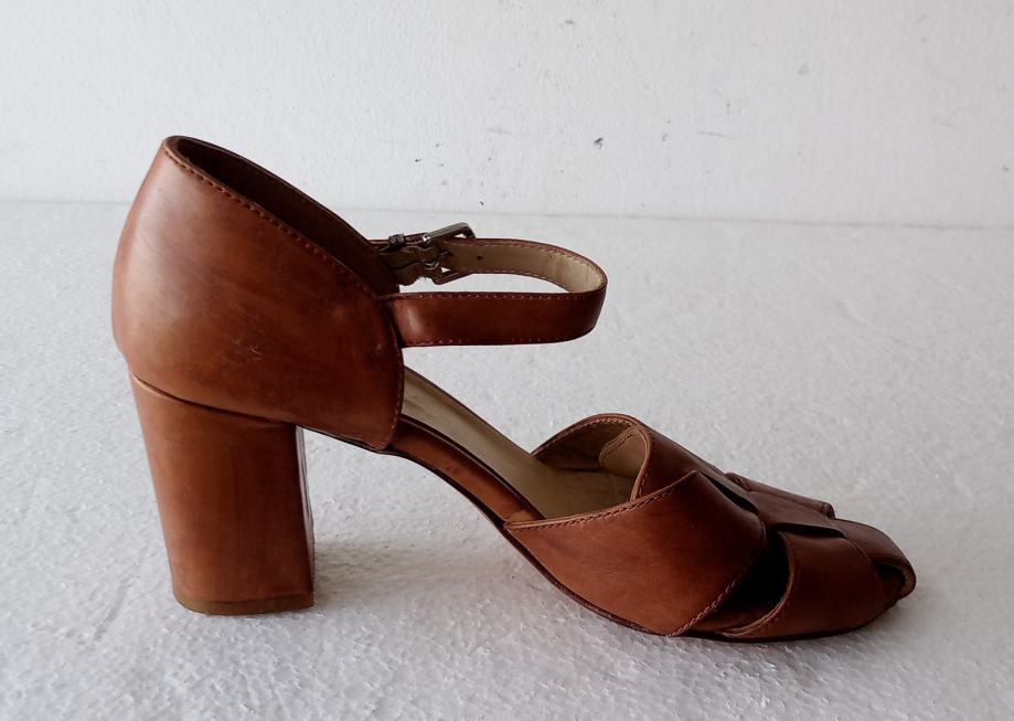 MALLY sandale od prirodne kože tople smeđe boje. Deklarirana veličina 39 (unutarnje gazište blizu 26 cm). Nisu za široko stopalo. Širina pete je 4,5 cm, a visina 8 cm. I potplati su od prirodne kože. Nošene kraće i očuvane.