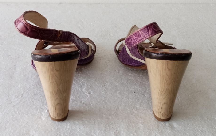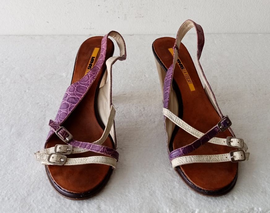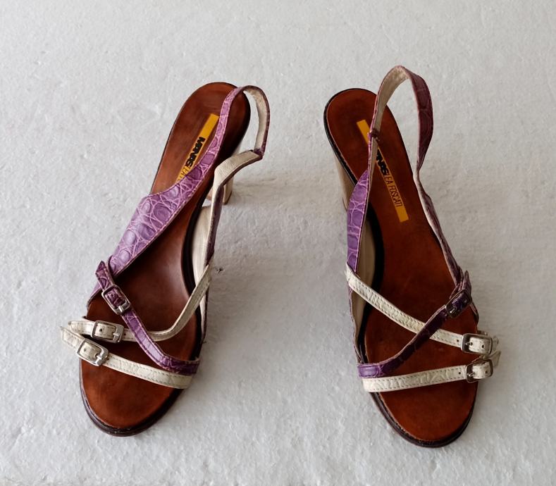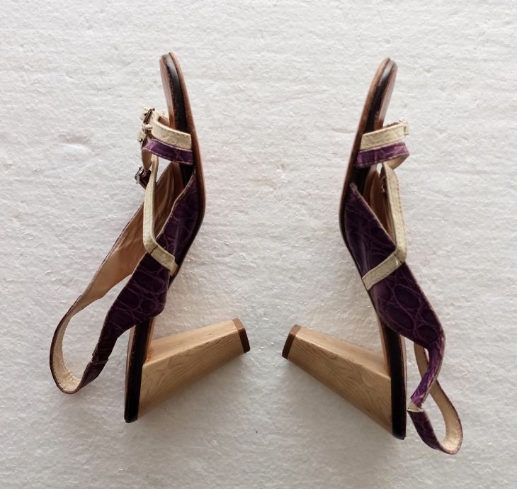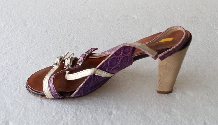 Damske sandale MANAS LEA FOSCATI u kroko dezenu. Veličina realni 38. Cijele od prirodne kože u kombinaciji kroko i glatke. Kroko dio je ljubičasto lila boje, a glatki bijele. Tabanice od prirodne kože. Džonovi od prirodne kože. Stabilna peta visoka 9,5 cm. Neko vrijeme korištene, ali potpuno očuvane.