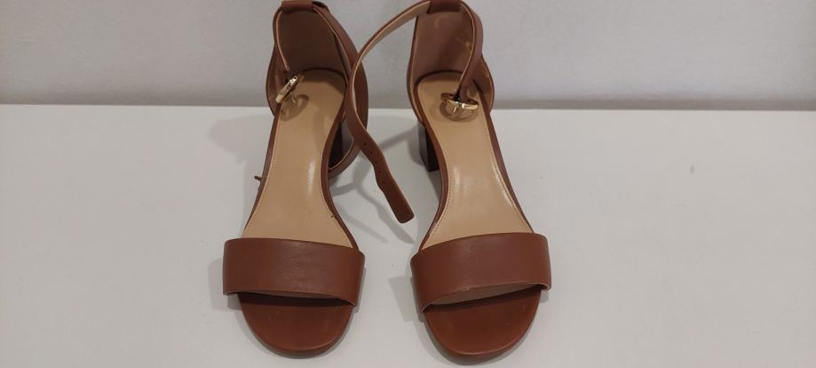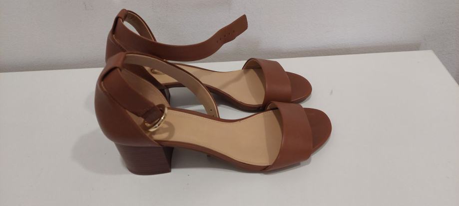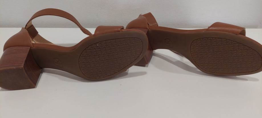 Smeđe sandale na petu, otvorenih pristiju, zatvorene pete, s kopčanjem oko zgloba, kožne (gornji i donji dio), ugodne za nošenje