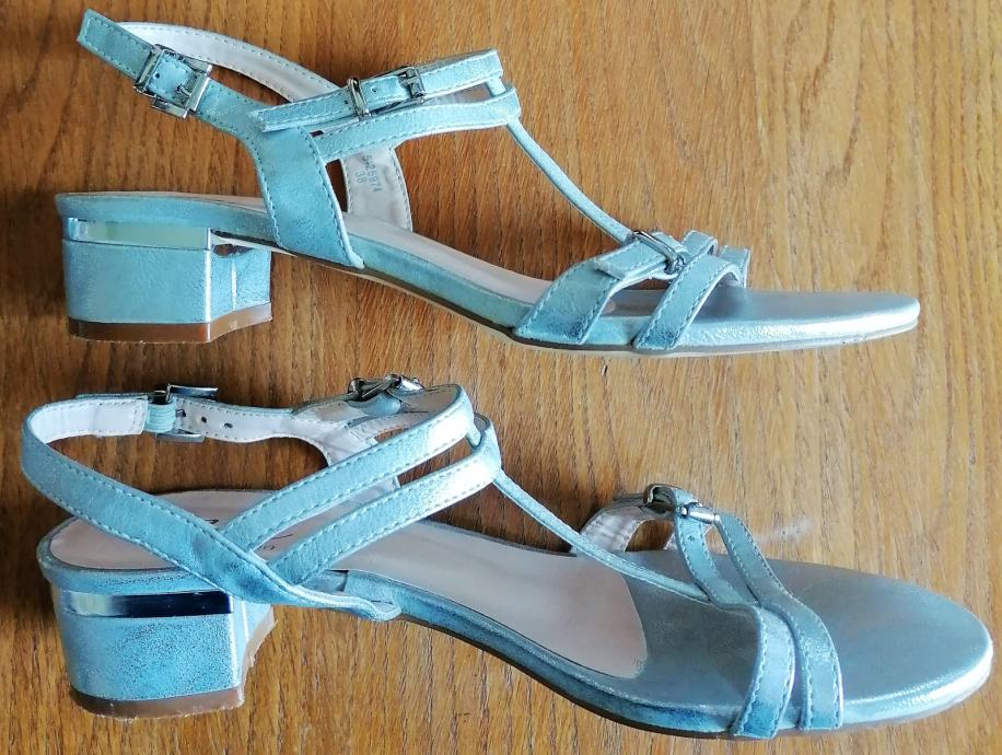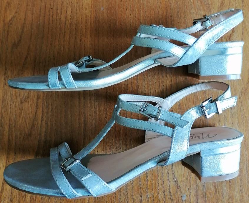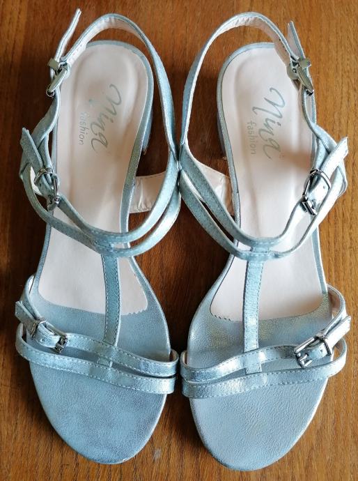 Srebrne kožne sandale "Nina fashion" sa tankim remenčićima, srebrnnim kopčama i malom stabilnom petom.