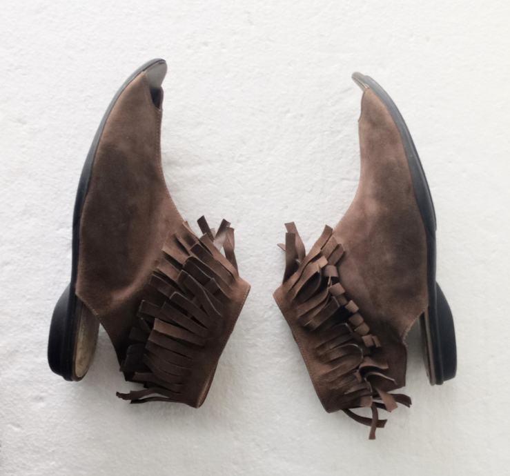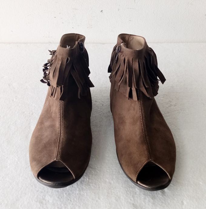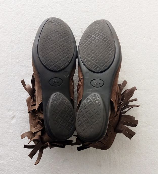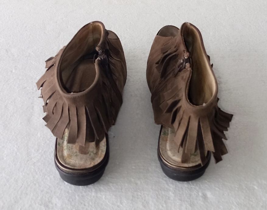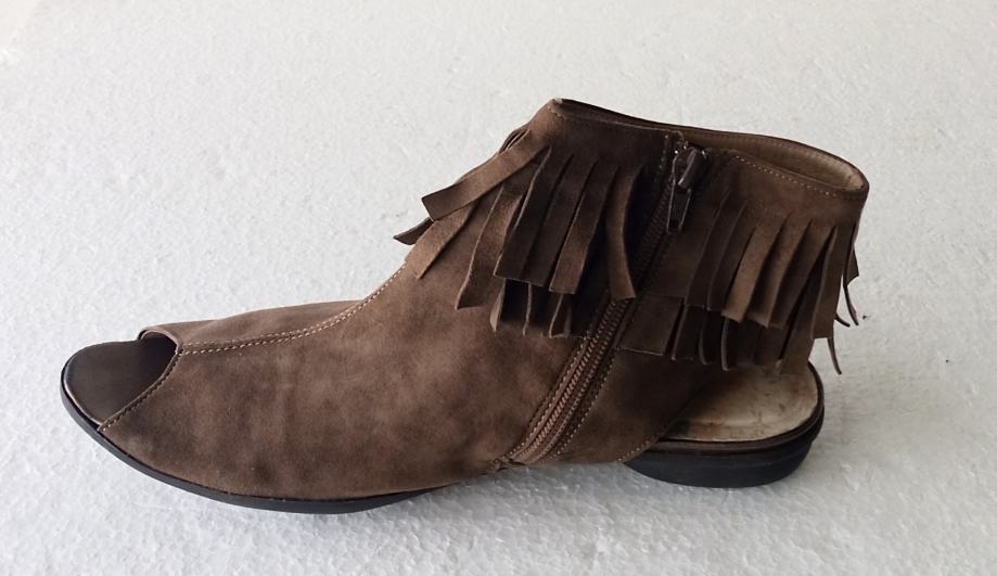 Raritetne Peko sandale/gležnjače sa resicama. Deklarirana veličina je 39. Za uže stopalo su. Gornjište i iznutra je izrađeno od prirodne velur kože. Peta je 2 cm visine. U odličnom stanju, mada nošene neko vrijeme.