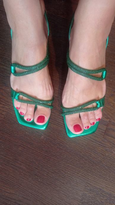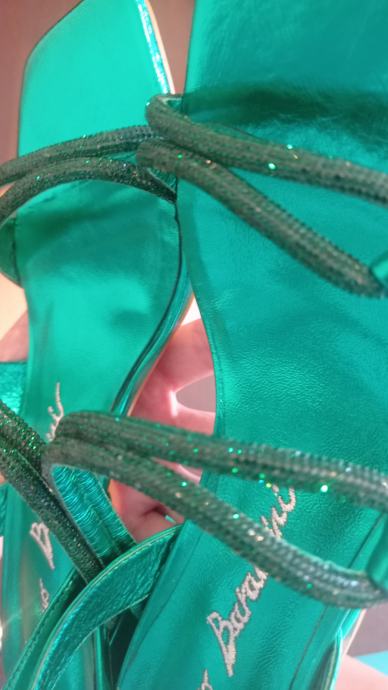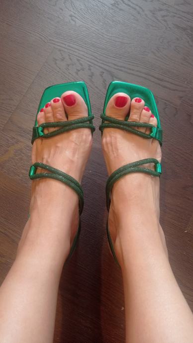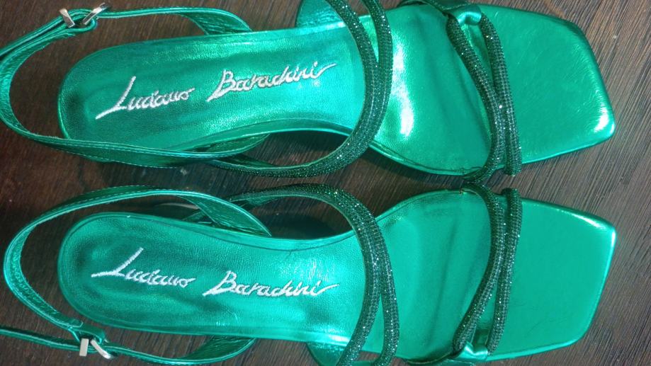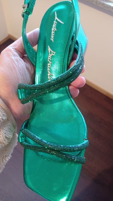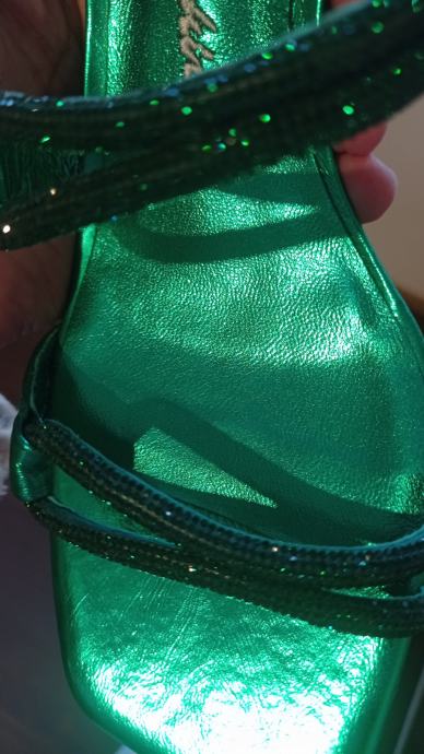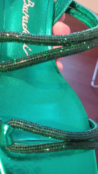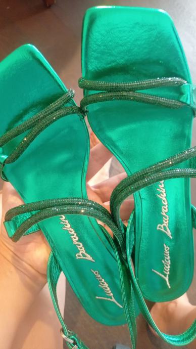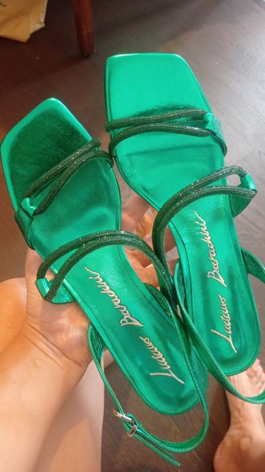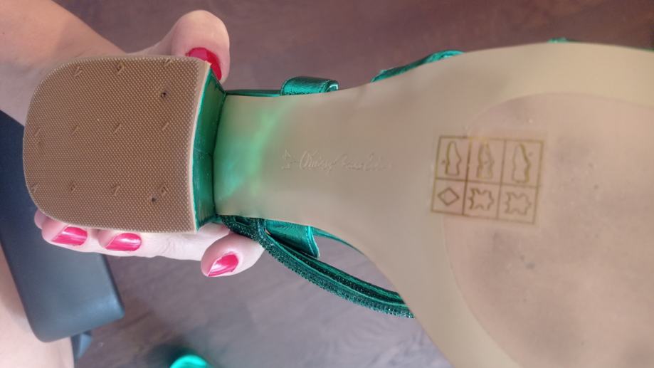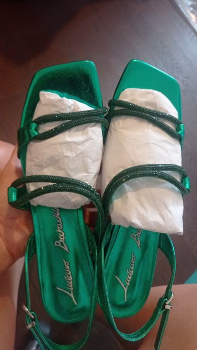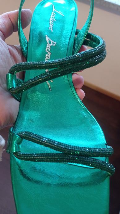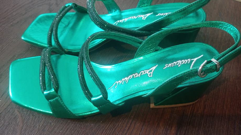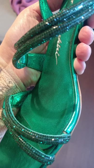 Prodajem nove talijanske unikatne kožne zelene sandale, ručni rad, predivne, perfektno udobne, sa svjetlucavim kamenčićima, stabilna povišena peta visine cca 6.5-7 cm, br 41, plaćene 105 eura, puna cijena je bila 189 eura. Podstavljene gume na petama kod postolara. Ima zaštitnu vrećicu i kutiju. Super povoljno prodajem, prilika!