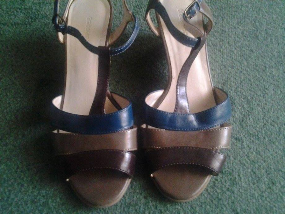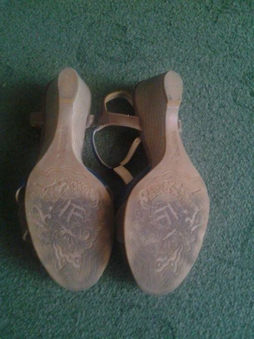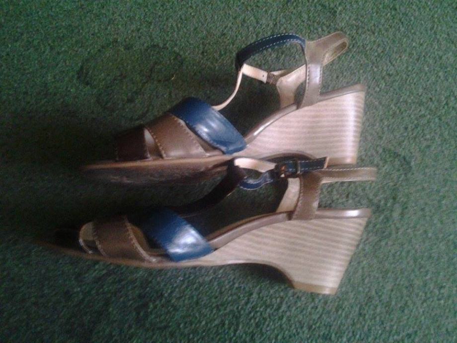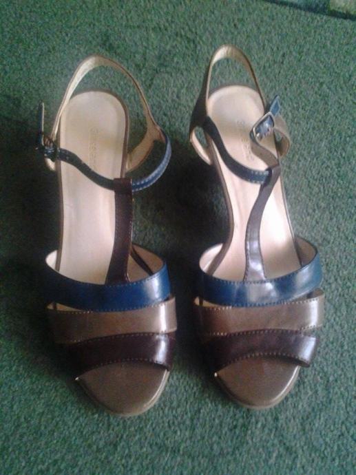 Sandale broj 36, boje nijanse smeđe i plave, na petu. Nosene par puta, jako dobro očuvane.