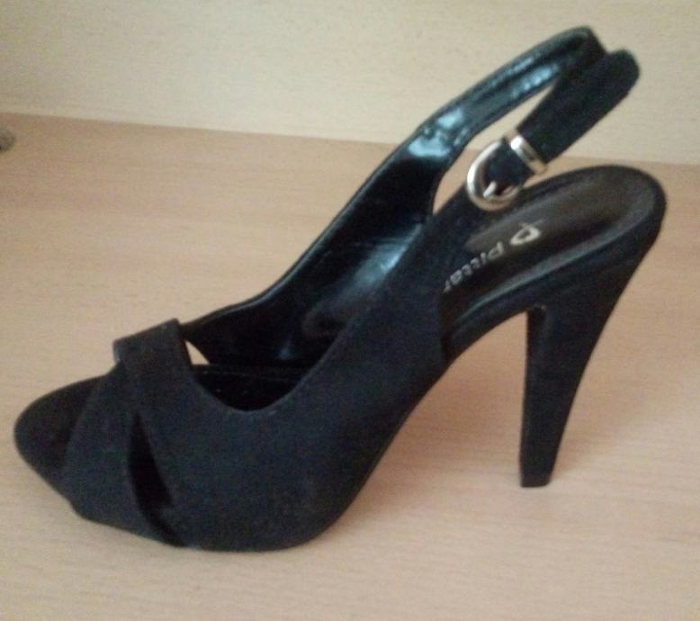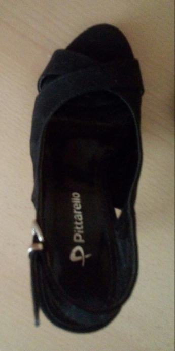Crne Pittarello sandale na petu, 2x nošene, kao nove, neoštećene. Model je za užu nogu, br. 36. Materijal: brušena koža. Visina pete: 9,5 cm