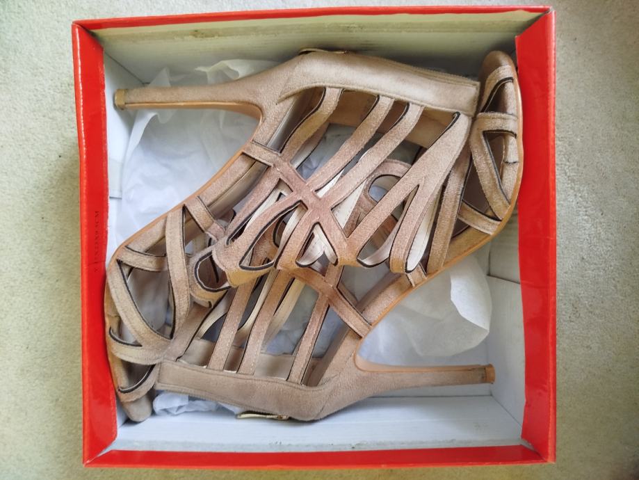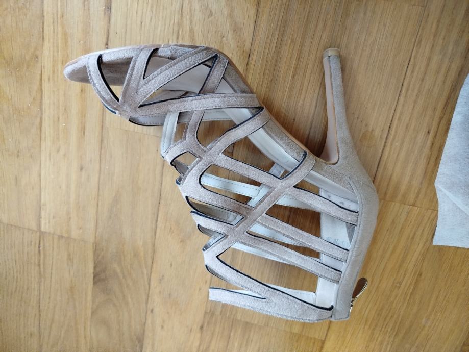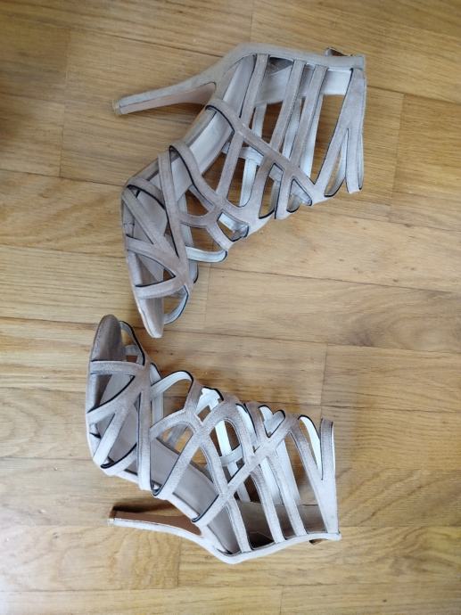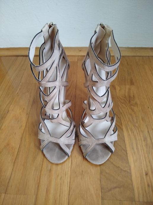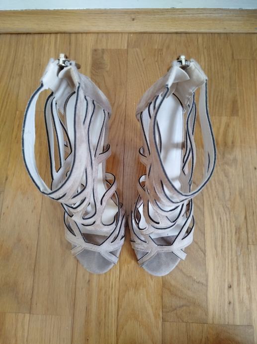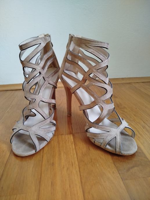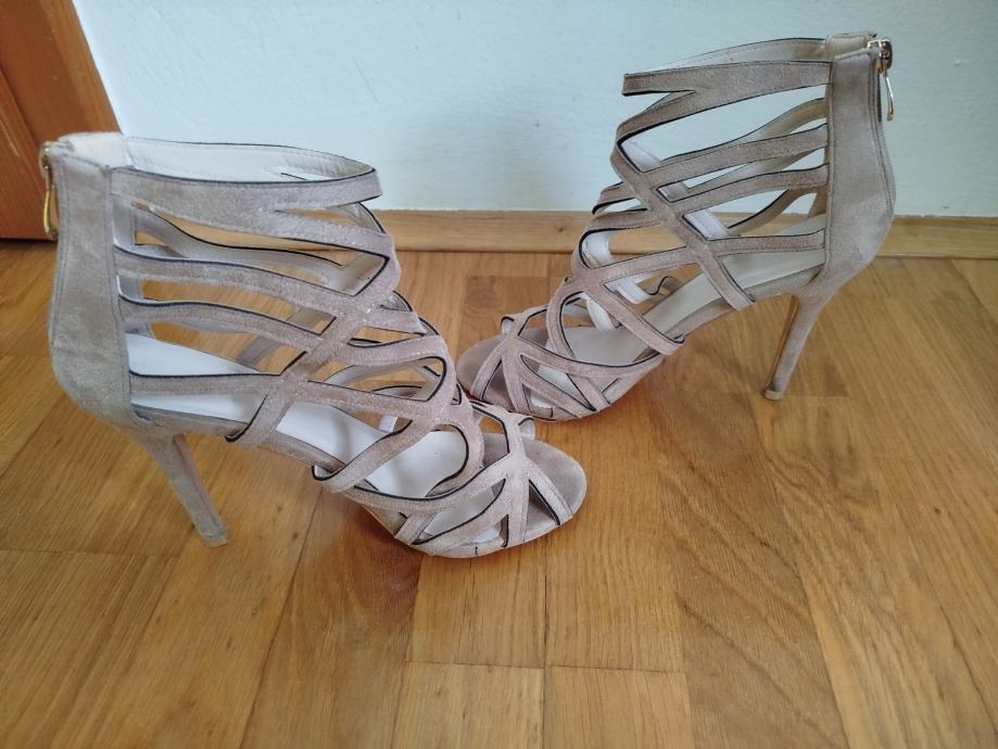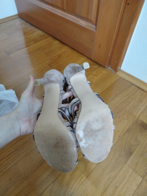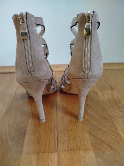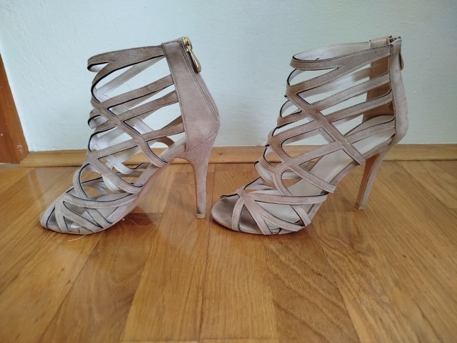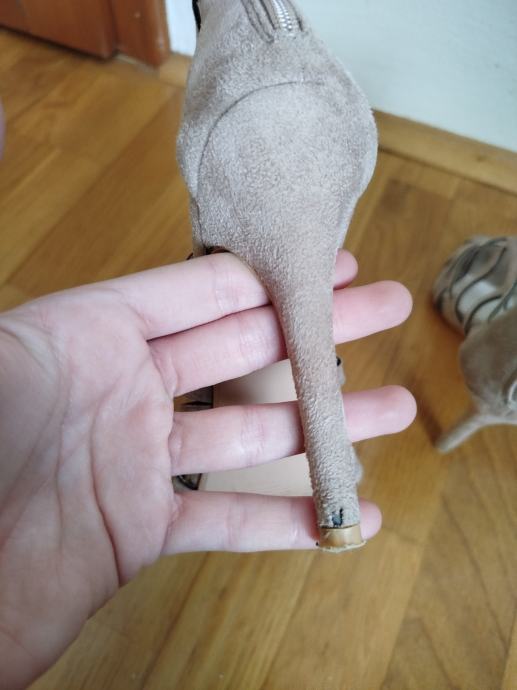 Štikle na visoku petu. Boja bež. Stabilne jer postoji potpora za cijelu nogu, tako da su udobne. Nošene su jednom, postoji ogrebotina kod lijevog špica pete. Dobiju se zamjenski fleksovi (donji dio pete štikle), 2 komada. Visina pete 11 cm. Veličina 39. Boja bež.