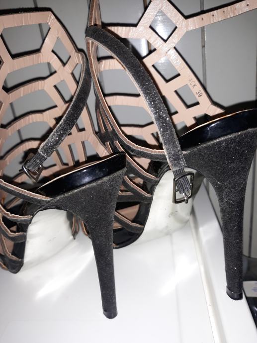 SANDALE ŽENSKE BR.39, jednom nosene, crne sa sitnim šljokicama, visoka peta, 14 €, Zagreb, 098/1359 335.