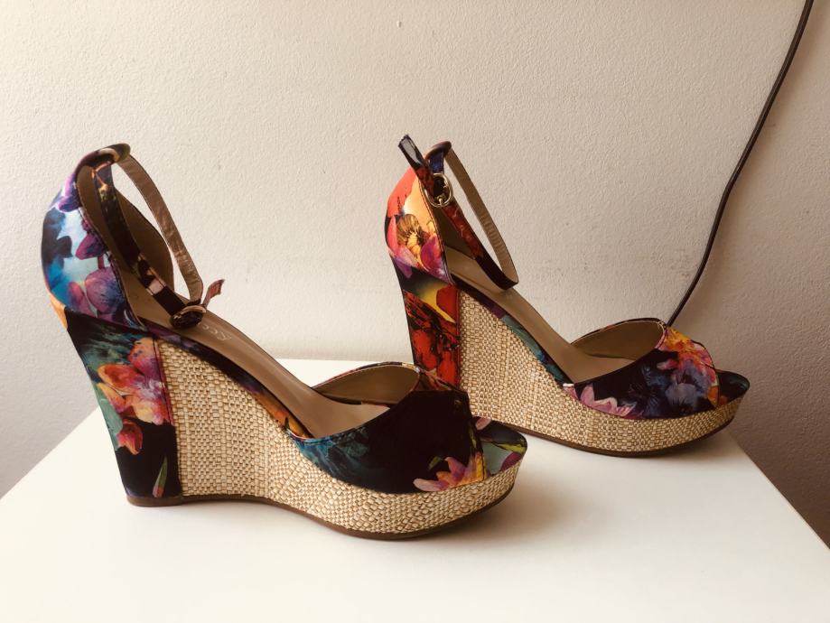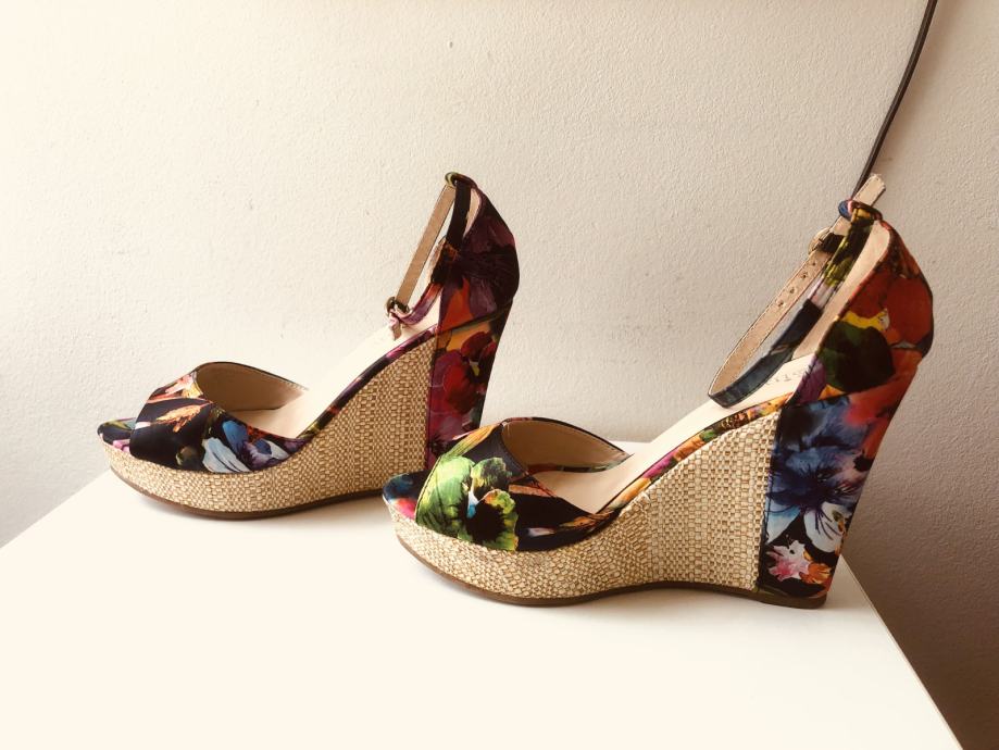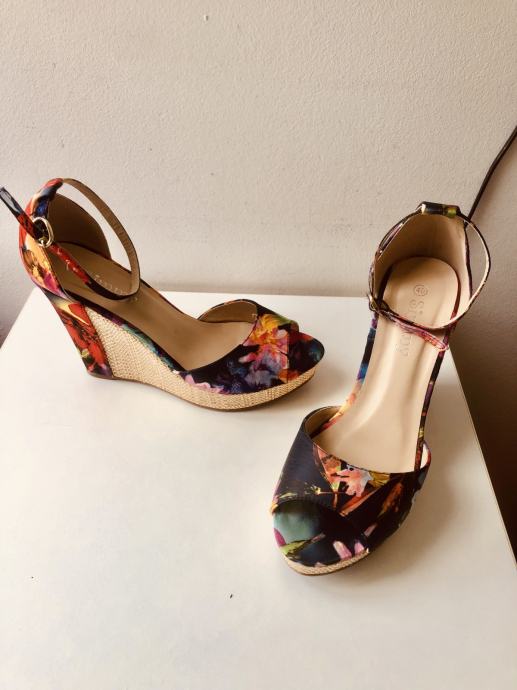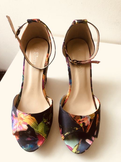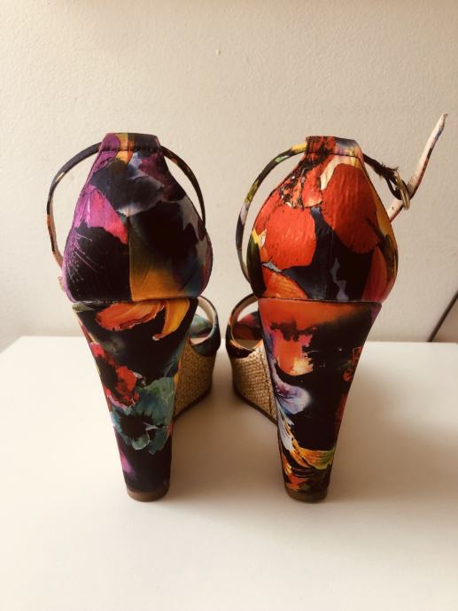 Kupljene u Mass-u, nošene 2 puta sa minimalnim tragovima nošenja na džonu. Prekrasne sa cvjetnim uzorkom, broj 40. Platforma naprijed 2,5 cm, peta 11 cm. Dužina potplate iznutra 25,5 cm.