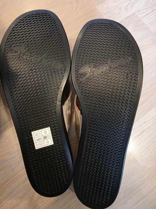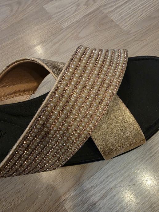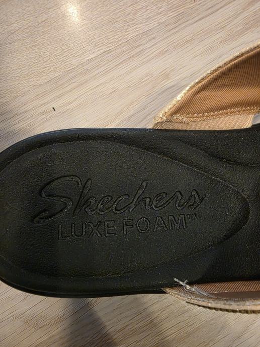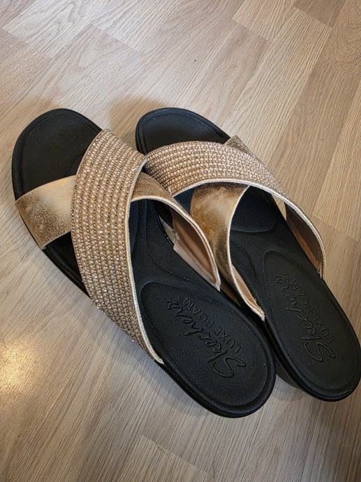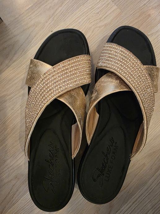 Prodajem izuzetno udobne ženske sandale brenda Skechers iz linije Luxe Foam. Sandale su ukrašene elegantnim zlatnim remenčićima i svjetlucavim kamenčićima, savršene za ljetne šetnje ili svečanije prigode.