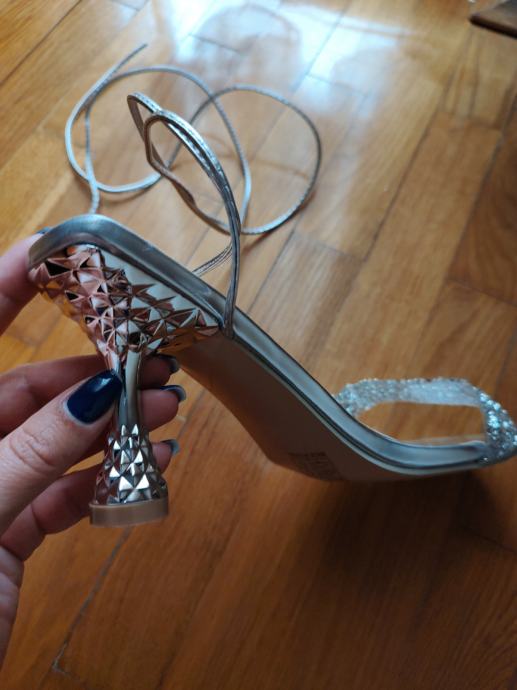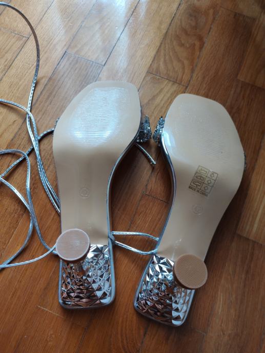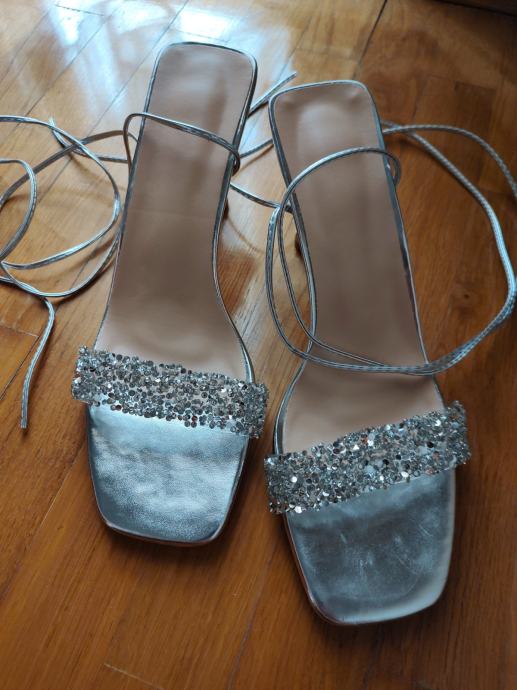 Srebrne sandale na petu, s vezanjem oko noge. Nisu nošene jer imam druge slične. Naznačena veličina je 42, ali odgovara EU veličini 40,5. Duljina stopala: 26,1. Visina pete: 8,5 cm.