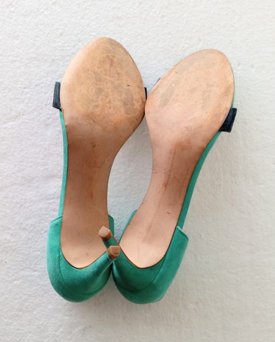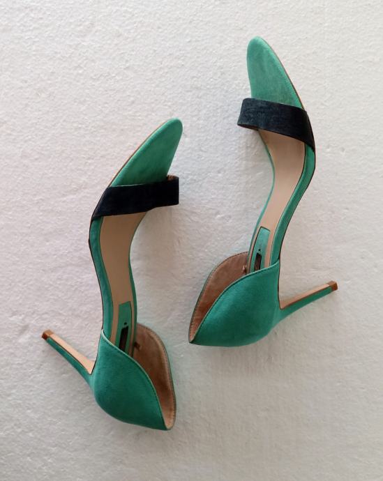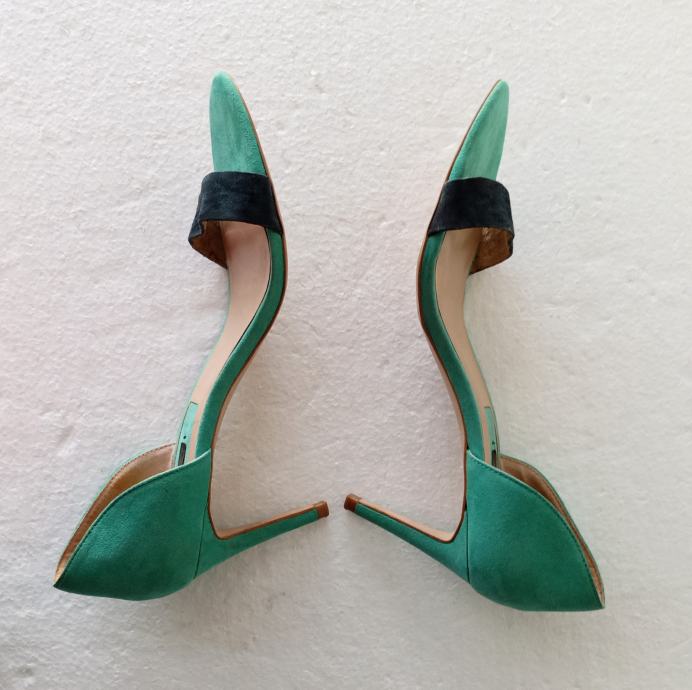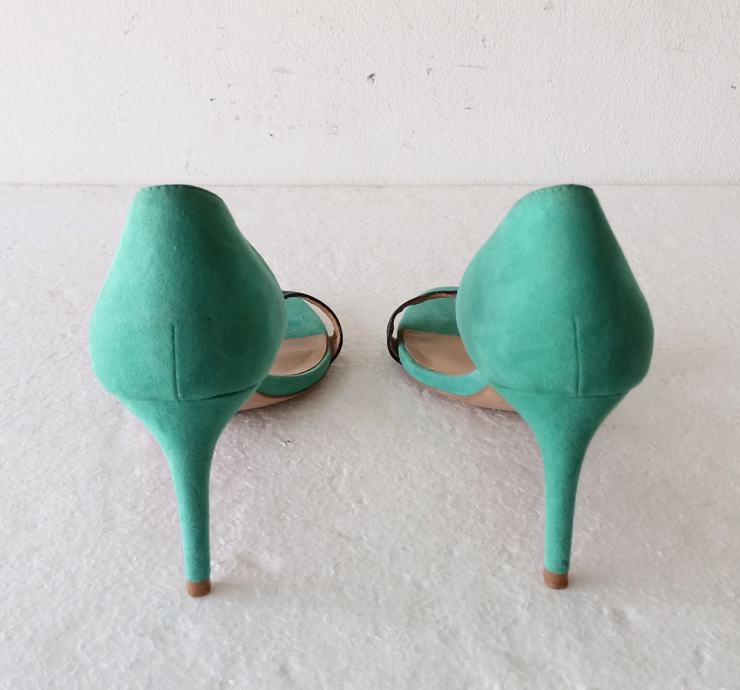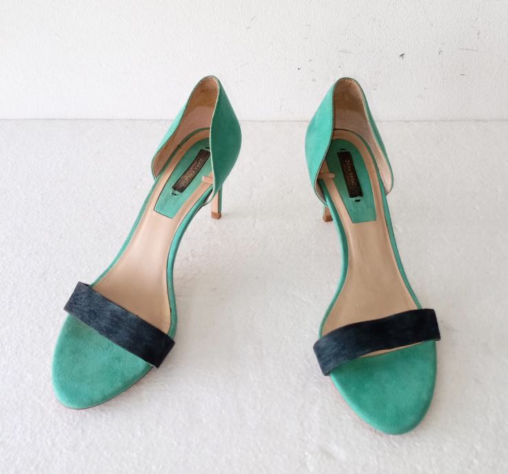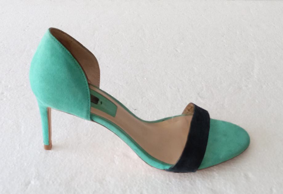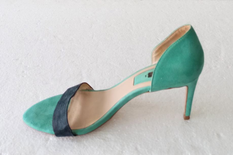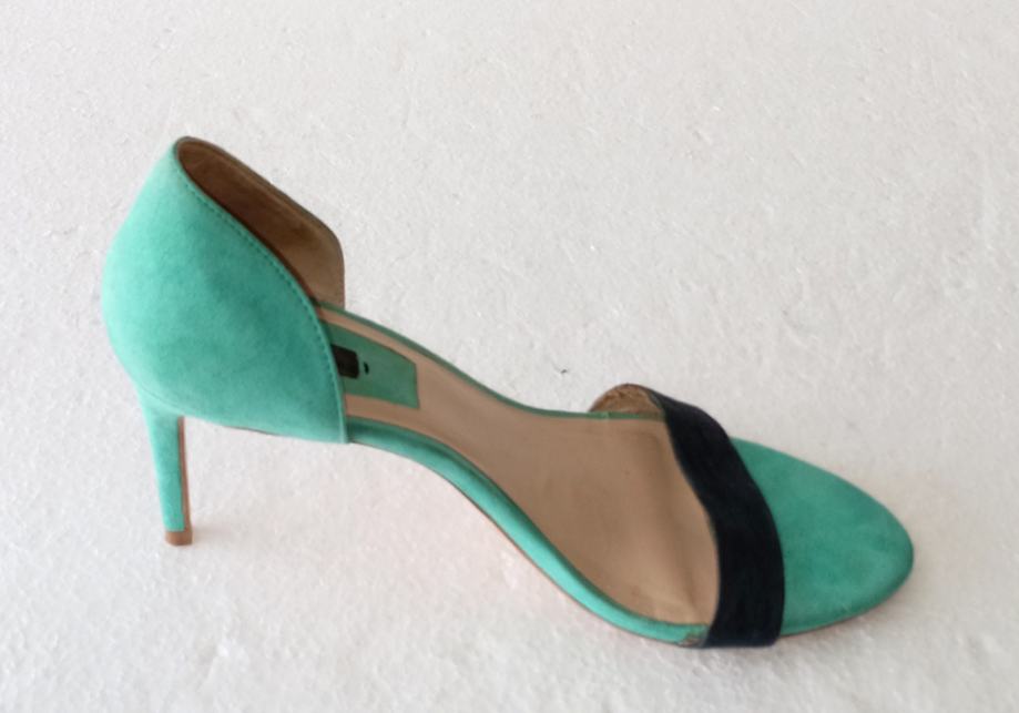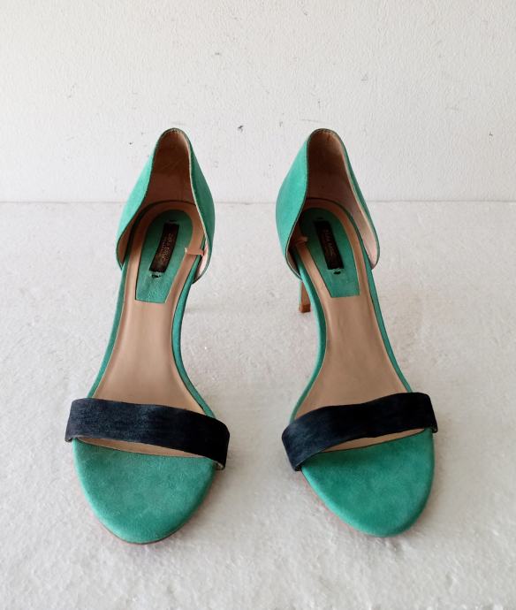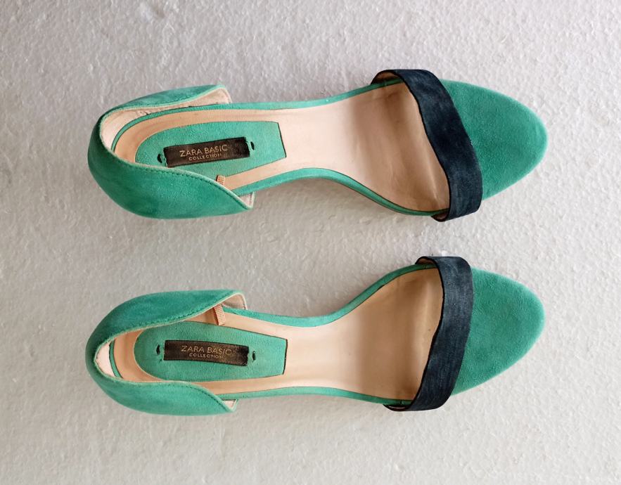 ZARA BASIC COLLECTION sandale, deklarirane veličine 41 (unutrašnje gajzište je 27 cm). Gornjište od uvjerljive imitacije velur kože. Bile su cijele u svijetlo plavoj boji, ali je zbog jedne kombinacije prednji remen ofarban u crno. Visina pete je 8,5 cm. Nošene par puta i u super stanju.