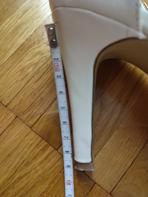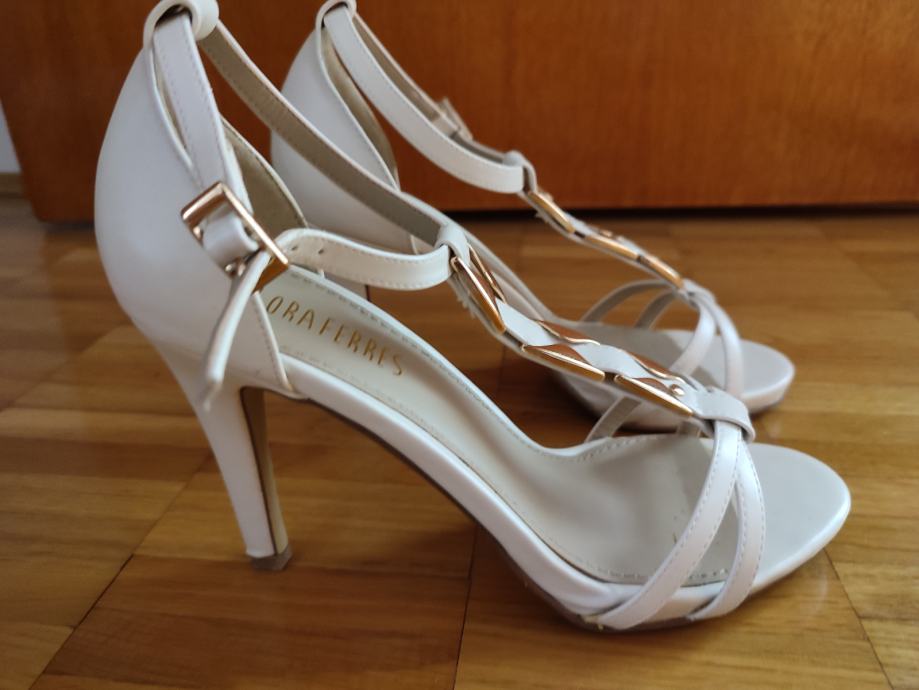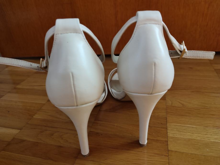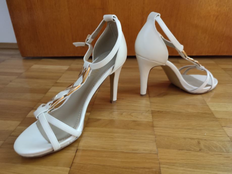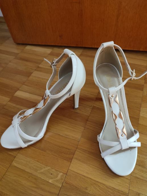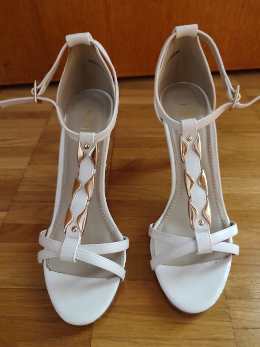 Bijele sandale na petu. Imaju čvrste remenčiće i zlatne ukrase. Broj 38, visoka peta cca 10 cm. Nošene jednom za vjenčanje. Predivno izgledaju na nozi!